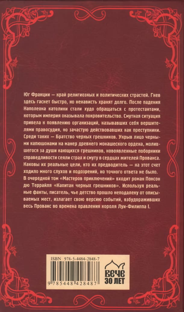 Юг Франции — край религиозных и политических страстей. Гнев здесь гаснет быстро, но ненависть хранят долго. После падения Наполеона католики стали худо обращаться с протестантами, которым империя оказывала покровительство. Смутная ситуация привела к появлению организаций, называвших себя вершителями правосудия, но зачастую действовавших как преступники. Среди таких — Братство черных грешников. Укрыв лицо черными капюшонами на манер древнего монашеского ордена, молившегося за души кающихся грешников, новоявленные поборники справедливости сеяли страх и смуту в сердцах жителей Прованса. Каковы их реальные цели, кто их предводитель — на этот счет ходило много слухов и подозрений, но точного ответа не было. В очередной том «Мастеров приключений» входит роман Понсон дю Террайля «Капитан черных грешников». Используя реальные факты, писатель, чье детство прошло неподалеку от описываемых мест, излагает свою версию событий, взбудораживших весь Прованс во времена правления короля Луи-Филиппа I.