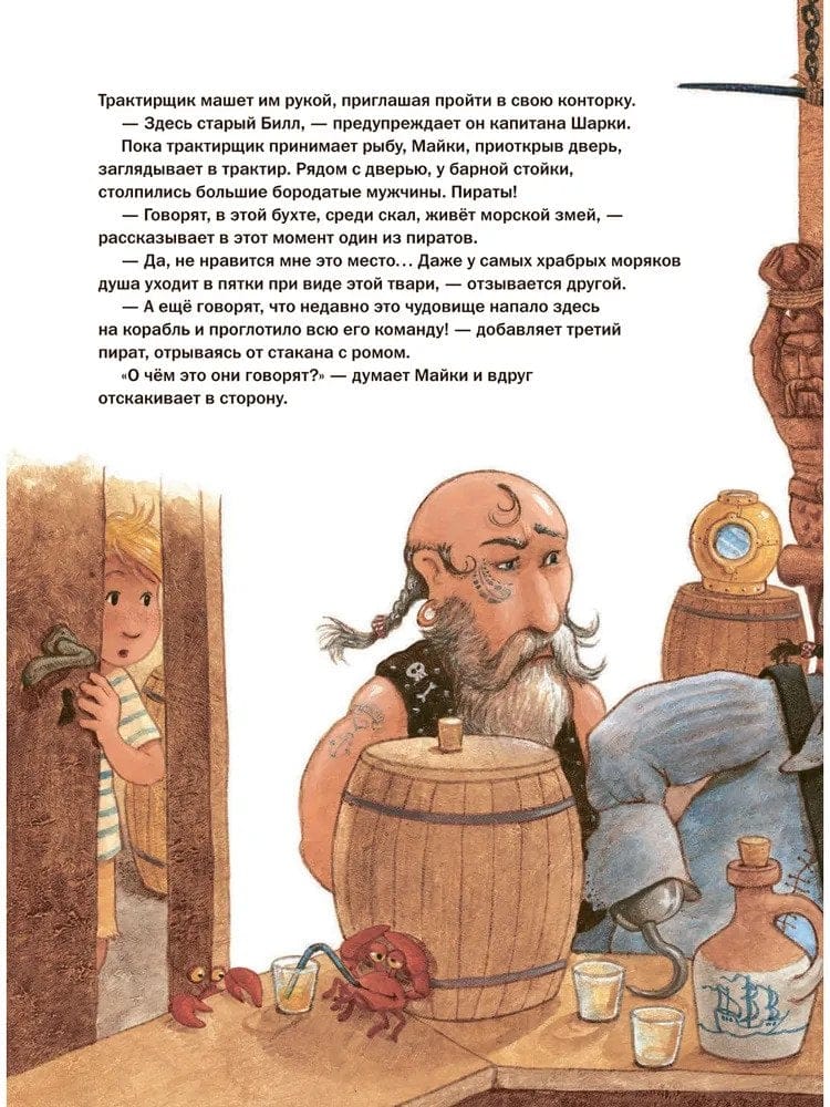 Пираты поговаривают, что неподалёку от гавани, где встал на якорь корабль капитана Шарки, объявилось морское чудовище. Среди матросов ходят слухи, что эта огромная тварь нападает на корабли и пожирает моряков, приводя в ужас даже самых отчаянных храбрецов. Капитан Шарки не верит этим сплетням, но когда маленький пират и его команда отправляются в новое путешествие, вода вокруг корабля начинает бурлить, и на поверхности моря показывается огромный морской змей. Всё осложняется тем, что капитана Шарки преследует на своём фрегате старый Билл, отъявленный негодяй, с которым капитан Шарки недавно поссорился…Вторая книга о приключениях капитана Шарки