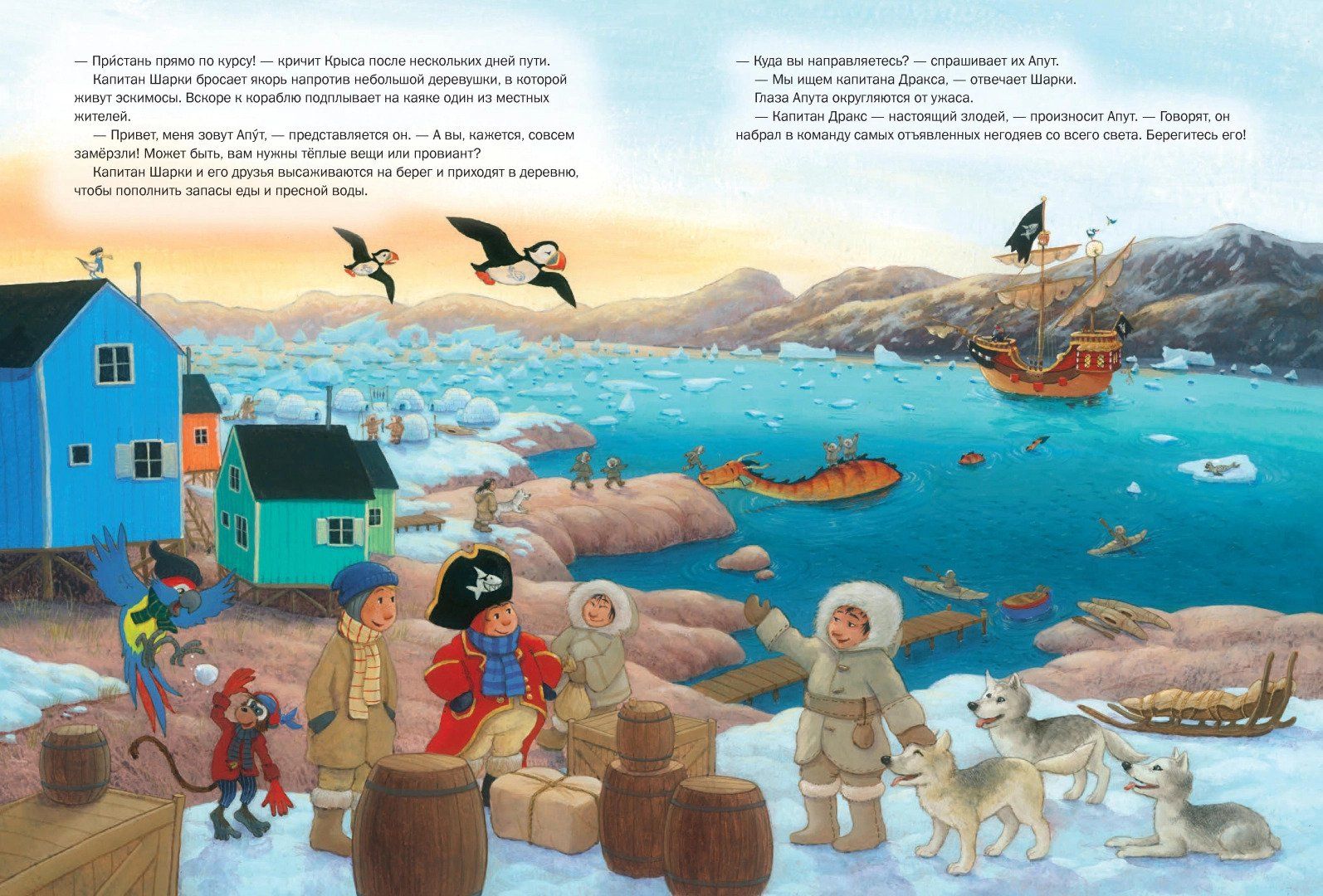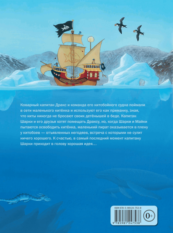 Коварный капитан Дракс и команда его китобойного судна поймали в сети маленького китёнка и используют его как приманку, зная, что киты никогда не бросают своих детёнышей в беде. Капитан Шарки и его друзья хотят помешать Драксу, но, когда Шарки и Майки пытаются освободить китёнка, маленький пират оказывается в плену у китобоев — отъявленных негодяев, встреча с которыми не сулит ничего хорошего. К счастью, в самый последний момент капитану Шарки приходит в голову хорошая идея…Седьмая книга о приключениях капитана Шарки