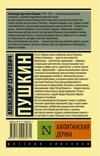 «Повести Белкина» – цикл из пяти повестей. Временами – трагические, временами – забавные, а порой даже мистические, они рассказывают нам истории о любви, мести, одиночестве, о поиске смысла жизни. «Дубровский» – увлекательный роман-повесть о внезапно вспыхнувшем чувстве между потомками двух враждующих семейств. «Капитанская дочка» – исторический роман, в котором на фоне крестьянского восстания Емельяна Пугачева разворачивается трогательная история любви. И наконец, неоконченное произведение «Арап Петра Великого» – первая попытка наиболее полно описать время правления Петра I, а также рассказ о судьбе предка Пушкина Абрама Петровича Ганнибала.