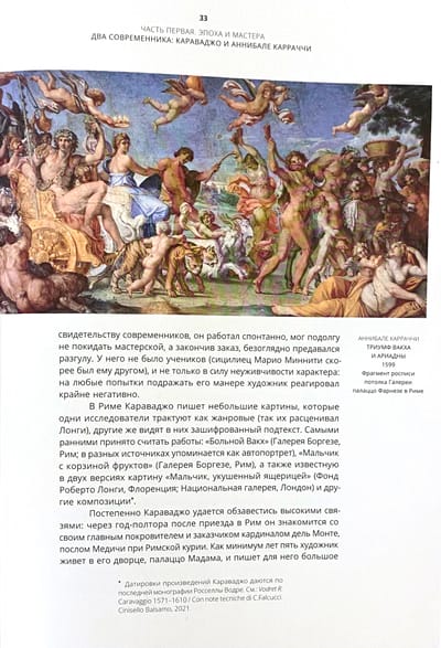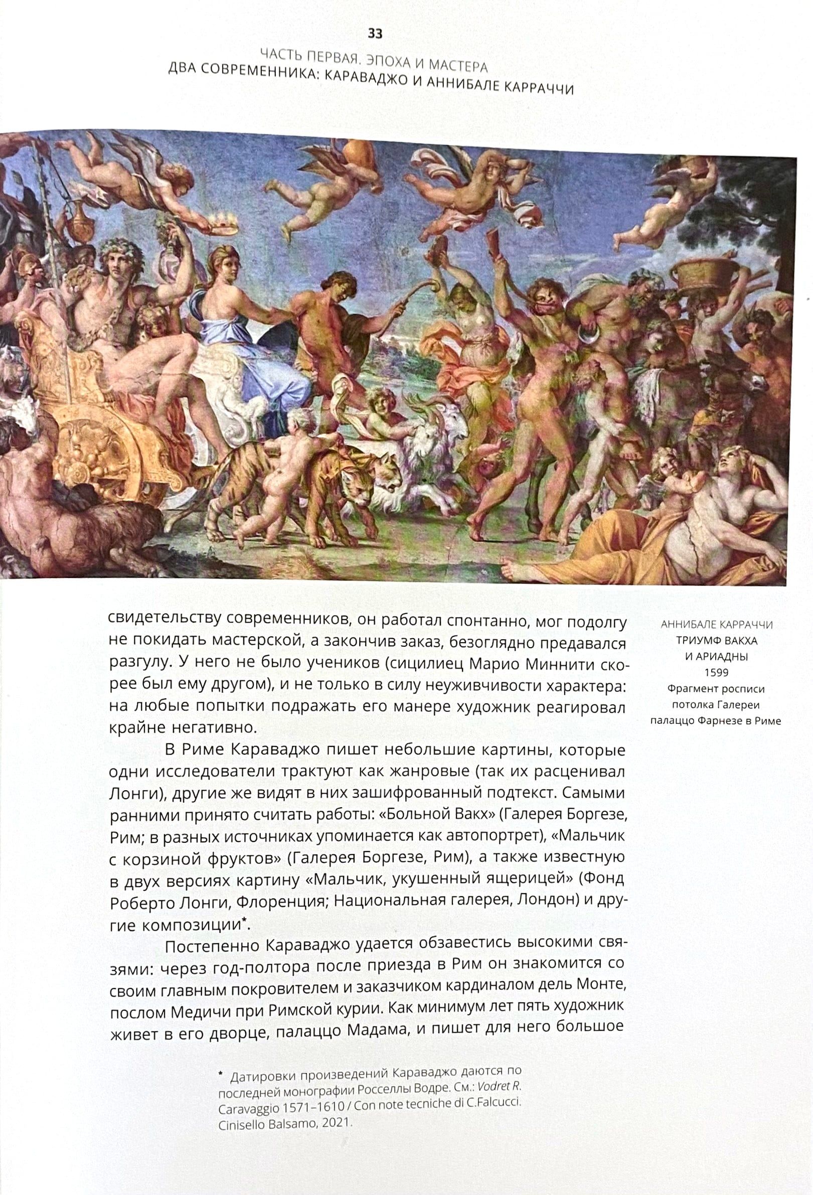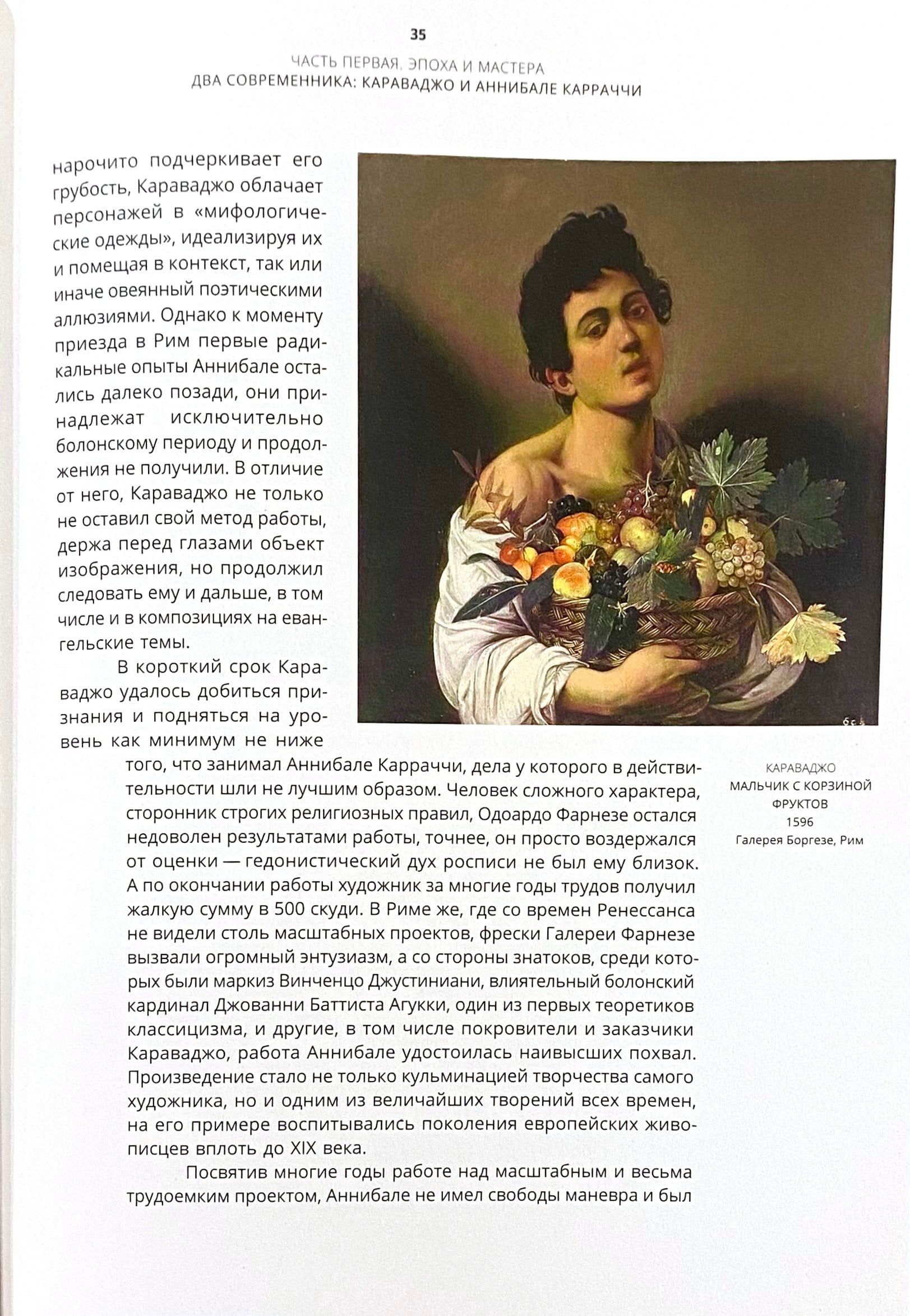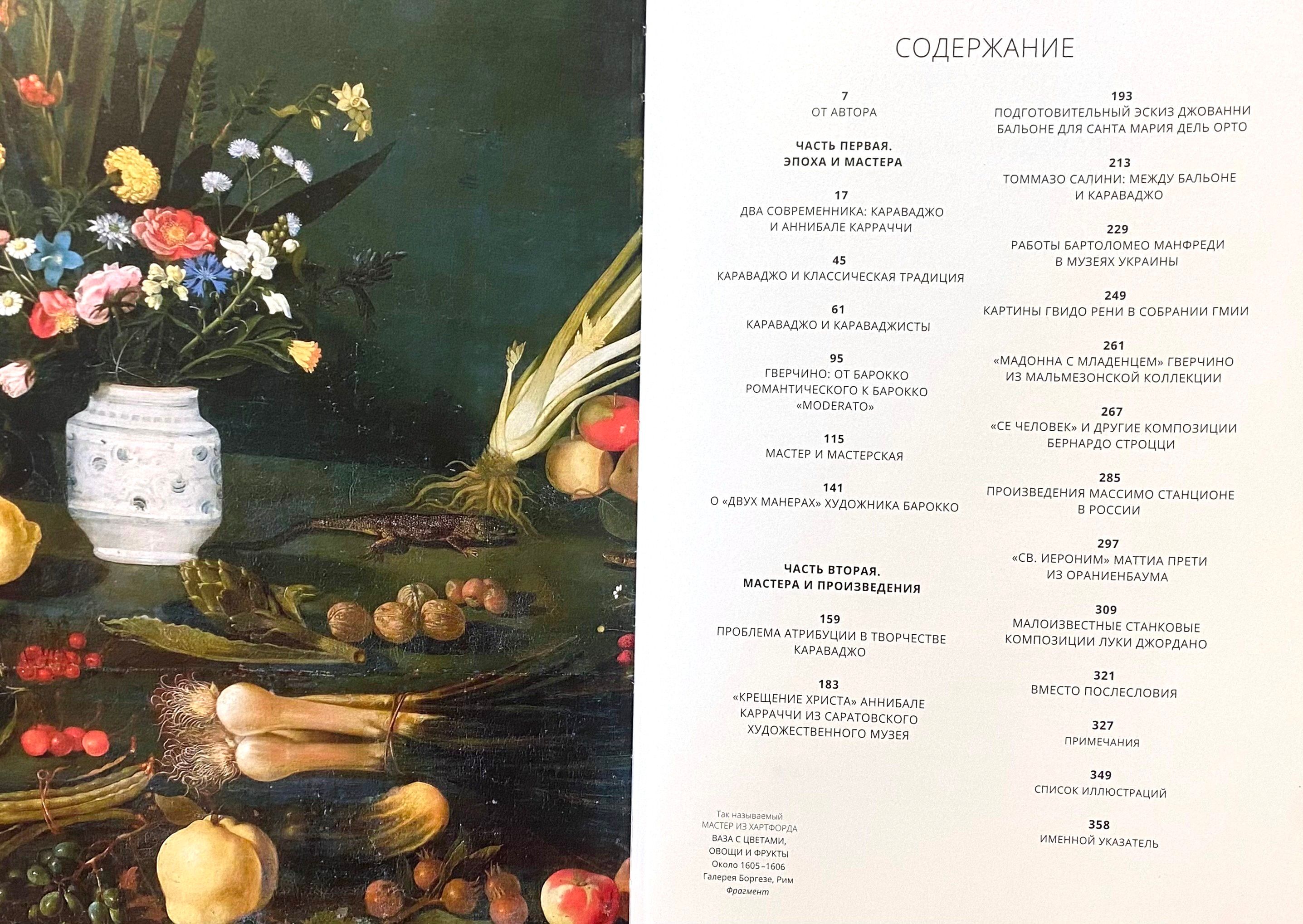 Книга Виктории Марковой, специалиста по искусству Италии эпохи Возрождения и барокко, посвящена итальянской живописи XVII века — ​от момента становления нового художественного языка до утверждения барокко, господствовавшего в Европе на протяжении почти двух столетий. Центральными фигурами здесь являются Караваджо, Аннибале Карраччи и их современники, работавшие в Риме и за его пределами. Идея книги родилась из личного опыта автора, а основой послужили публикации и атрибуции разных лет, а также тексты, написанные специально для этого издания. В них подняты важные вопросы, помогающие понять поворотный для всей европейской культуры период, когда между собой активно взаимодействовали самые разные тенденции.
