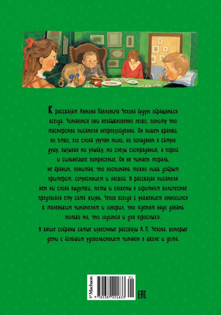В книге собраны самые известные и любимые рассказы А. П. Чехова. В них юмор сочетается с грустью и состраданием. Простые и тихие слова точнее всего отражают суть, попадают в самое сердце. Писатель не читает мораль и не бранит. Он понимает, что победить можно только смехом, добрым примером и сочувствием.