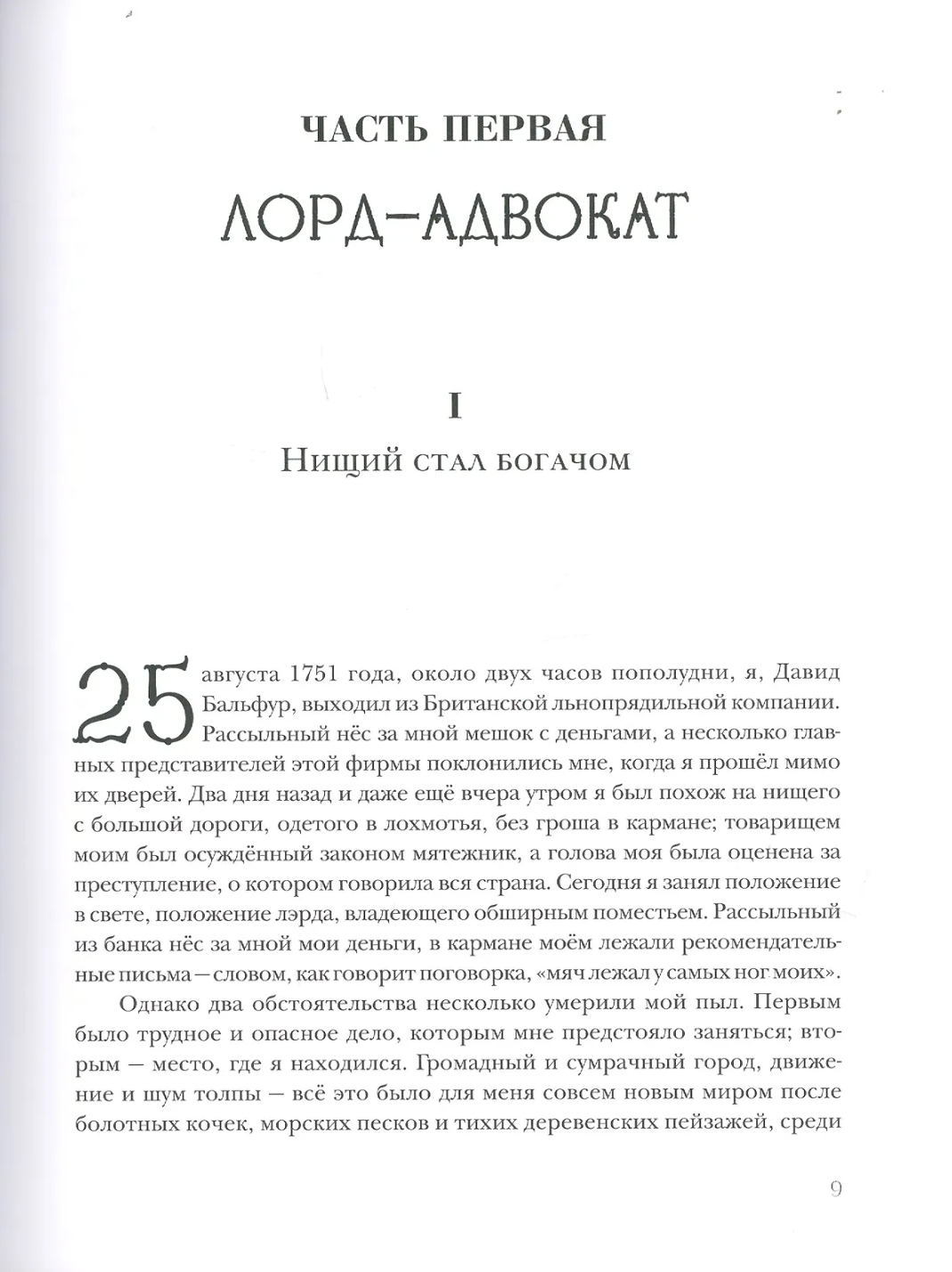 «Катриона» — второй роман дилогии Роберта Льюиса Стивенсона о приключениях Давида Бальфура. Молодой человек, став новым владельцем поместья Шоос, решает помочь своему другу Алану покинуть Шотландию и восстановить справедливость в отношении Джемса Стюарта, ложно обвинённого в громком политическом убийстве. Однако на пути Давида встаёт клан Кемпбеллов, который всеми средствами пытается помешать юноше, вступившемуся за жизнь и честь своих друзей. Но Давид не боится — он храбро бросается в круговорот опасных приключений, где встречает свою первую и настоящую любовь, гордую красавицу Катриону Друммонд… дочь объявленного вне закона преступника Джемса Мора и внучку легендарного шотландского разбойника Роб-Роя из клана Макгрегоров.