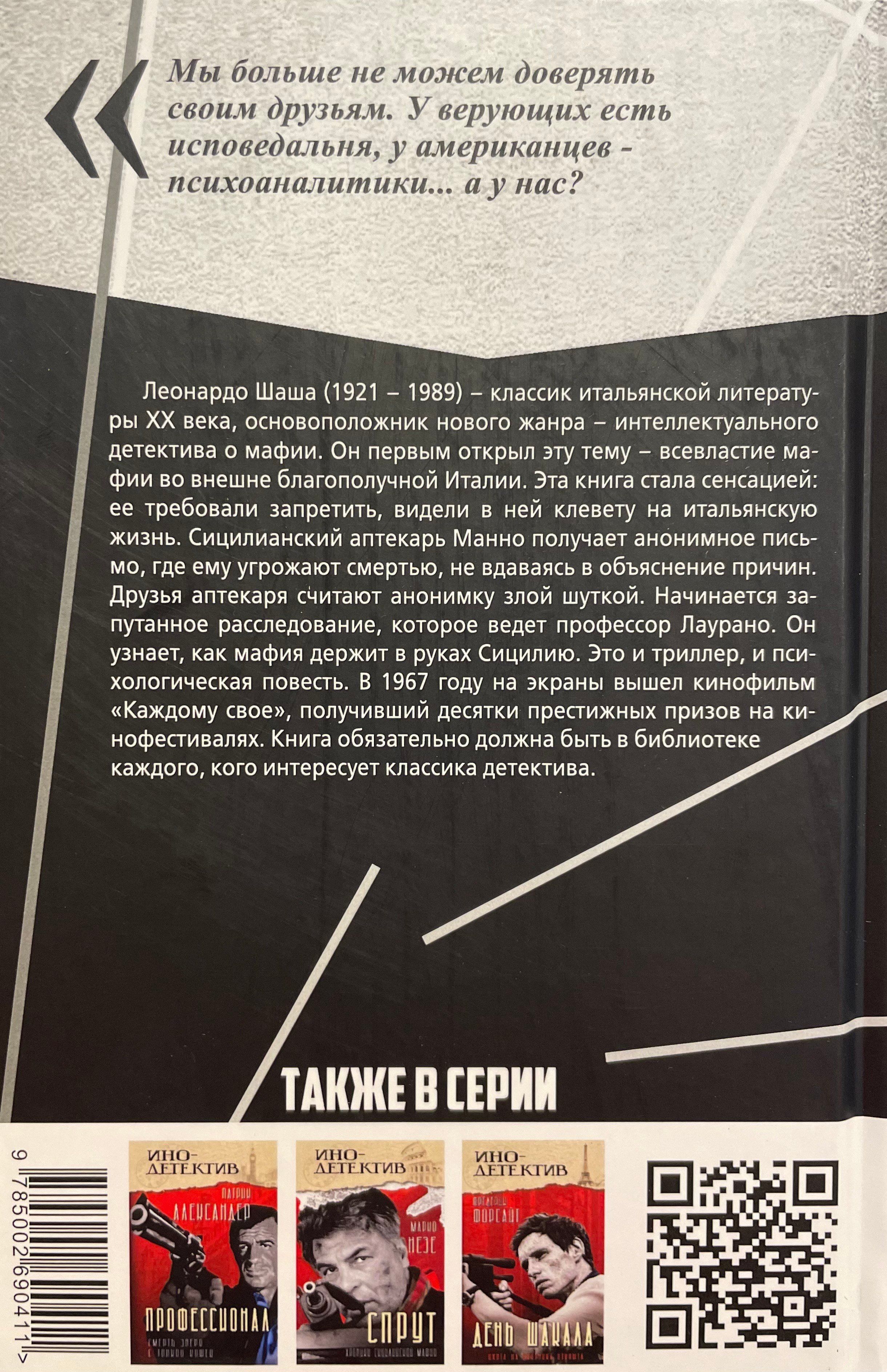 Леонардо Шаша (1921 – 1989) – классик итальянской литературы ХХ века, основоположник нового жанра – интеллектуального детектива о мафии. Он первым открыл эту тему – всевластие мафии во внешне благополучной Италии. Эта книга стала сенсацией: ее требовали запретить, видели в ней клевету на итальянскую жизнь. Сицилианский аптекарь Манно получает анонимное письмо, где ему угрожают смертью, не вдаваясь в объяснение причин. Друзья аптекаря считают анонимку злой шуткой. Начинается запутанное расследование, которое ведет профессор Лаурано. Он узнает, как мафия держит в руках Сицилию. Это и триллер, и психологическая повесть. В 1967 году на экраны вышел кинофильм «Каждому свое» ,получивший десятки престижных призов на кинофестивалях. Книга обязательно должна быть в библиотеке каждого, кого интересует классика детектива.