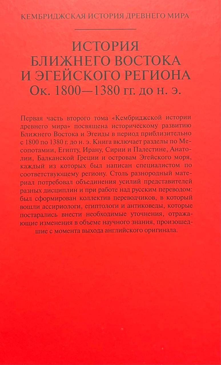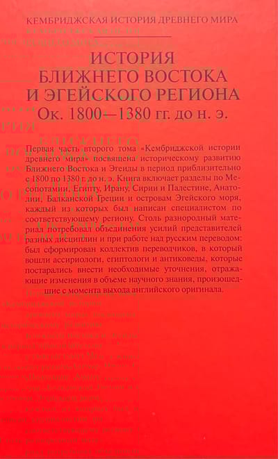 Первая часть второго тома «Кембриджской истории древнего мира» посвящена историческому развитию Ближнего Востока и Эгеиды в период приблизительно с 1800 по 1380 г. до н. э. Книга включает разделы по Месопотамии, Египту, Ирану, Сирии и Палестине, Анатолии, Балканской Греции и островам Эгейского моря, каждый из которых был написан специалистом по соответствующему региону. Столь разнородный материал потребовал объединения усилий представителей разных дисциплин и при работе над русским переводом: был сформирован коллектив переводчиков, в который вошли ассириологи, египтологи и антиковеды, которые постарались внести необходимые уточнения, отражающие изменения в объеме научного знания, произошедшие с момента выхода английского оригинала.