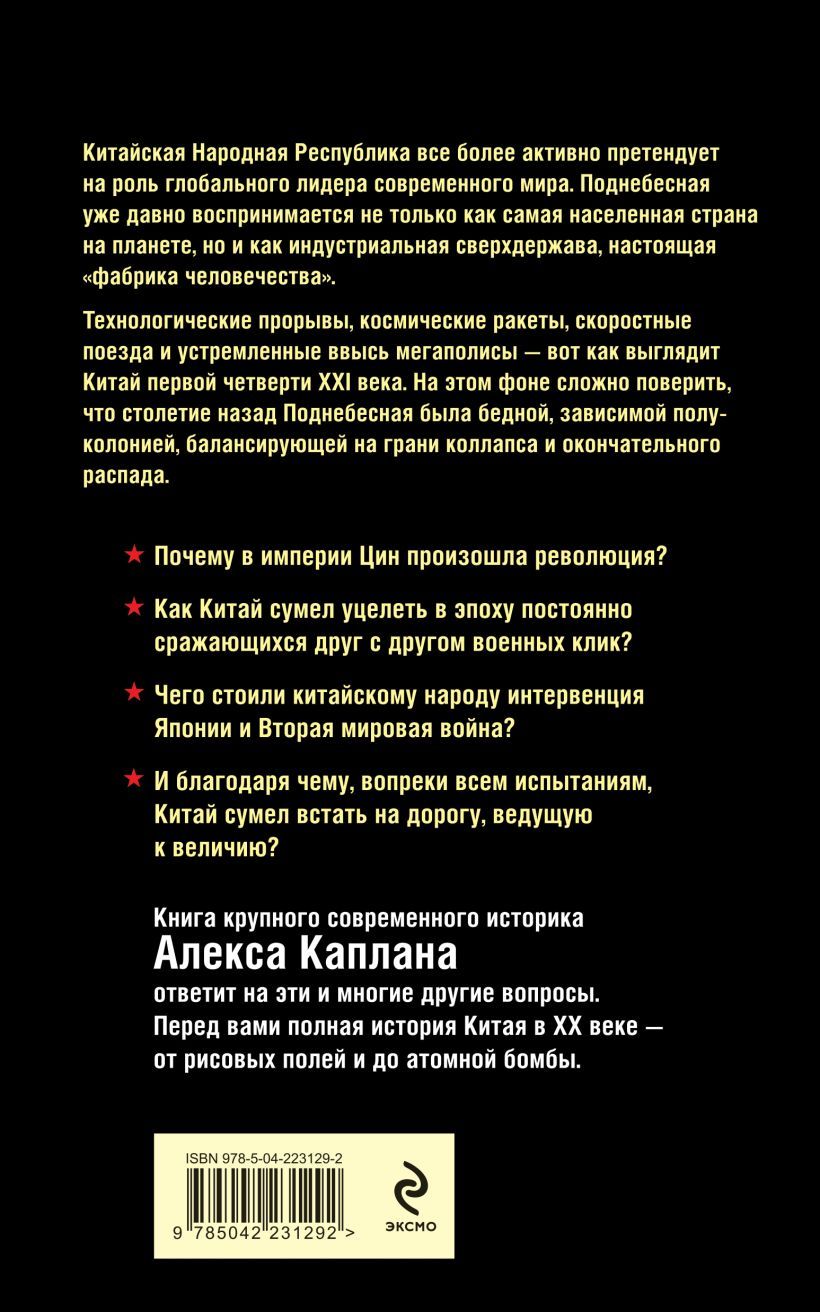 Почему в империи Цин произошла революция? Как Китай сумел уцелеть в эпоху постоянно сражающихся друг с другом военных клик? Чего стоила китайскому народу интервенция Японии и Вторая Мировая война? И благодаря чему, вопреки всем испытаниям, Китай сумел встать на дорогу, ведущую к величию? Книга крупного современного историка Алекса Каплана ответит на эти и многие другие вопросы. Перед вами полная история Китая в XX веке – от рисовых полей и до атомной бомбы.