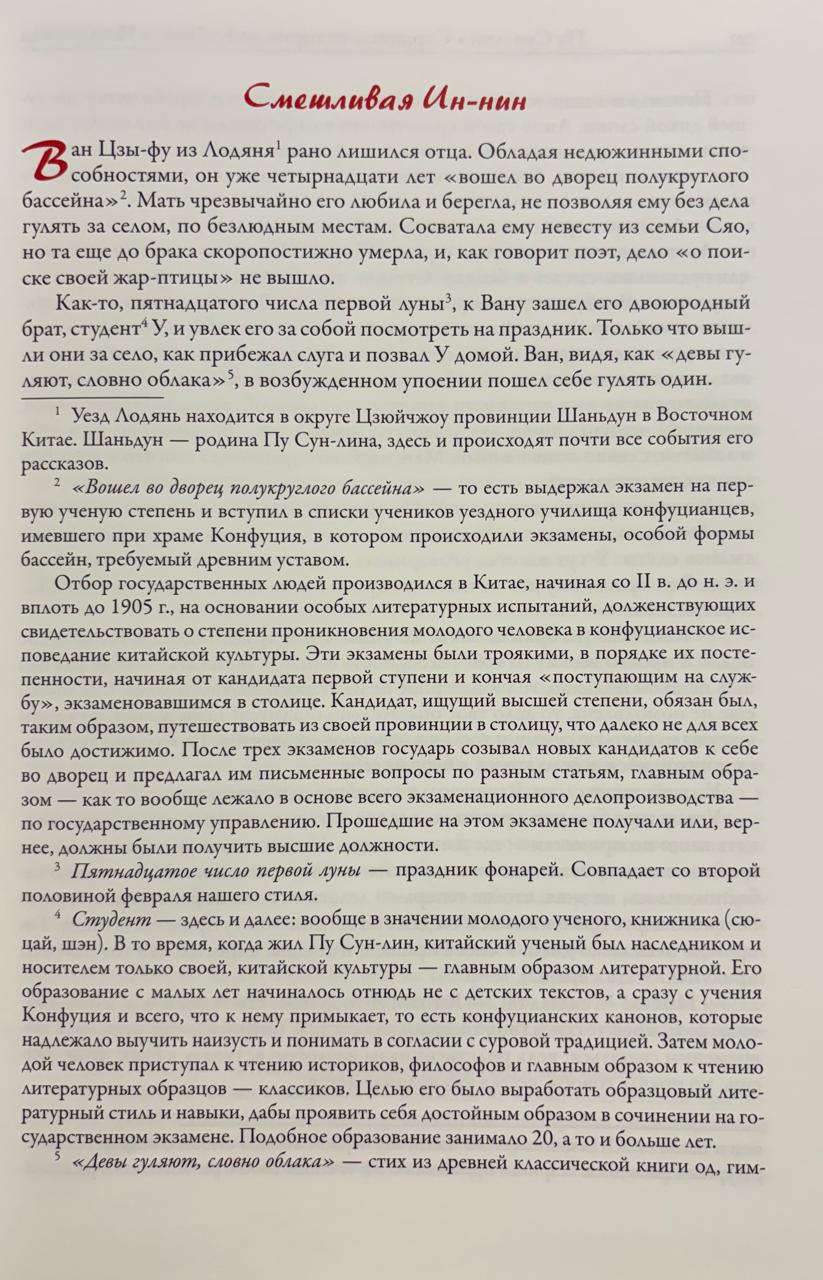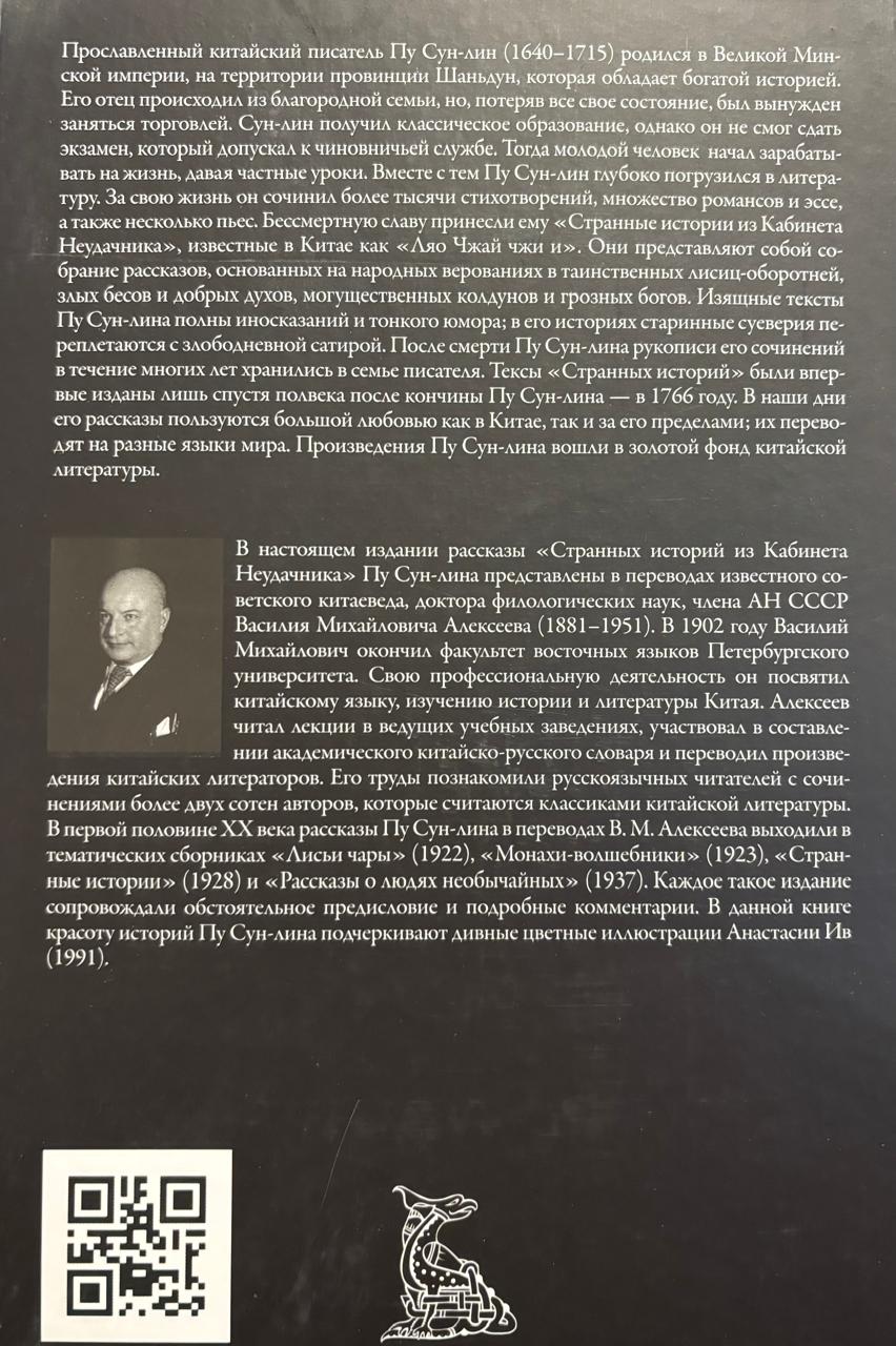 В настоящем издании рассказы «Странных историй из Кабинета Неудачника» Пу Сун-лина представлены в переводах известного советского китаеведа, доктора филологических наук, члена АН СССР Василия Михайловича Алексеева (1881–1951). В 1902 году Василий Михайлович окончил факультет восточных языков Петербургского университета. Свою профессиональную деятельность он посвятил китайскому языку, изучению истории и литературы Китая. Алексеев читал лекции в ведущих учебных заведениях, участвовал в составлении академического китайско-русского словаря и переводил произведения китайских литераторов. Его труды познакомили русскоязычных читателей с сочинениями более двух сотен авторов, которые считаются классиками китайской литературы. В первой половине XX века рассказы Пу Сун-лина в переводах В. М. Алексеева выходили в тематических сборниках «Лисьи чары» (1922), «Монахи-волшебники» (1923), «Странные истории» (1928) и «Рассказы о людях необычайных» (1937). Каждое такое издание сопровождали обстоятельное предисловие и подробные комментарии. В данной книге красоту историй Пу Сун-лина подчеркивают дивные цветные иллюстрации Анастасии Ив (1991).