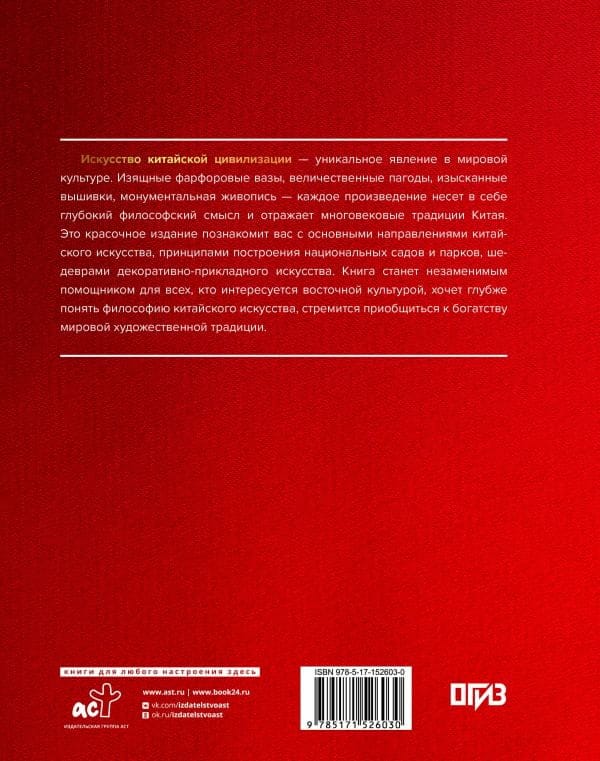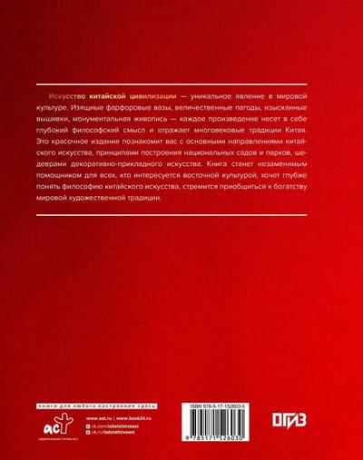 Искусство китайской цивилизации — уникальное явление в мировой культуре. Изящные фарфоровые вазы, величественные пагоды, изысканные вышивки, монументальная живопись — каждое произведение несет в себе глубокий философский смысл и отражает многовековые традиции Китая. Это красочное издание познакомит вас с основными направлениями китайского искусства, принципами построения национальных садов и парков, шедеврами декоративноприкладного искусства.