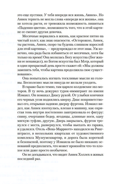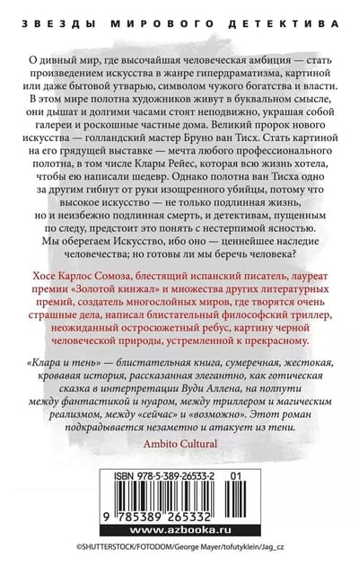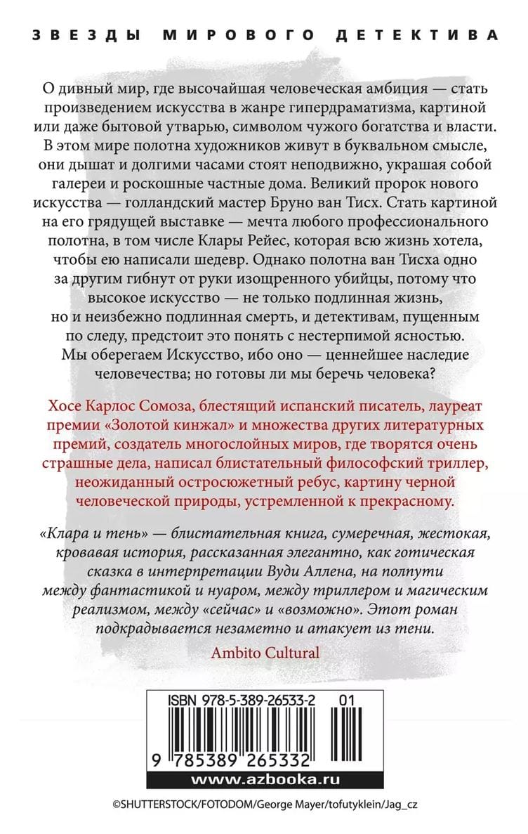 Великий пророк нового искусства — голландский мастер Бруно ван Тисх. Стать картиной на его грядущей выставке — мечта любого профессионального полотна, в том числе Клары Рейес, которая всю жизнь хотела, чтобы ею написали шедевр. Однако полотна ван Тисха одно за другим гибнут от руки изощренного убийцы, потому что высокое искусство — не только подлинная жизнь, но и неизбежно подлинная смерть, и детективам, пущенным по следу, предстоит это понять с нестерпимой ясностью. Мы оберегаем Искусство, ибо оно — ценнейшее наследие человечества; но готовы ли мы беречь человека? Хосе Карлос Сомоза, блестящий испанский писатель, лауреат премии «Золотой кинжал» и множества других литературных премий, создатель многослойных миров, где творятся очень страшные дела, написал блистательный философский триллер, неожиданный остросюжетный ребус, картину черной человеческой природы, устремленной к прекрасному.