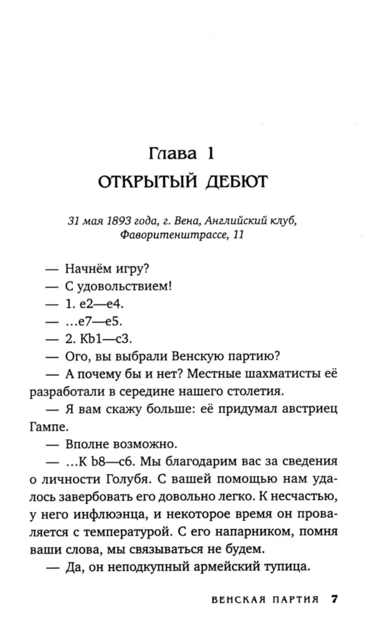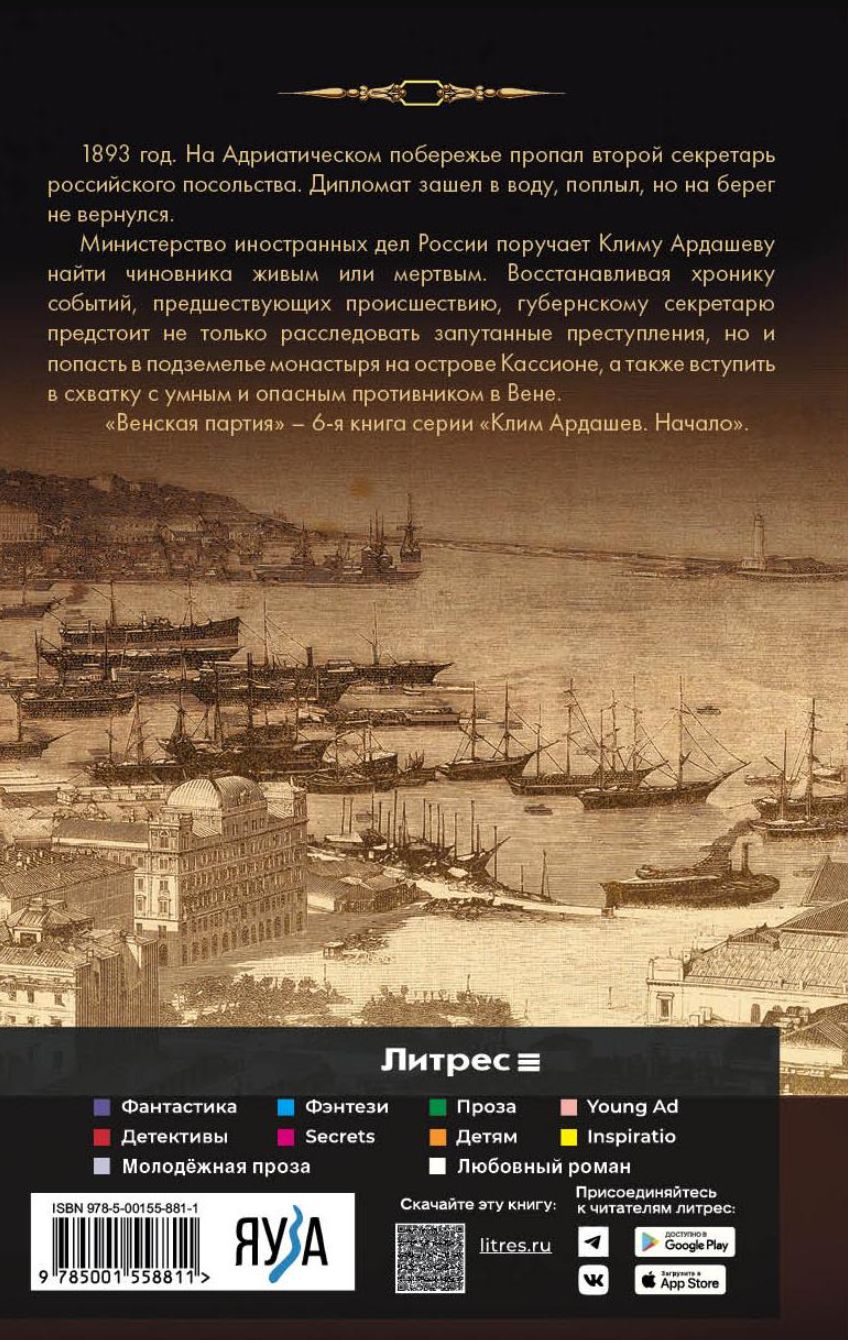 1893 год. На Адриатическом побережье пропал второй секретарь российского посольства. Дипломат зашел в воду, поплыл, но на берег не вернулся. Министерство иностранных дел России поручает Климу Ардашеву найти чиновника живым или мертвым. Восстанавливая хронику событий, предшествующих происшествию, губернскому секретарю предстоит не только расследовать запутанные преступления, но и попасть в подземелье монастыря на острове Кассионе, а также вступить в схватку с умным и опасным противником в Вене. «Венская партия» — 6-я книга серии «Клим Ардашев. Начало».
