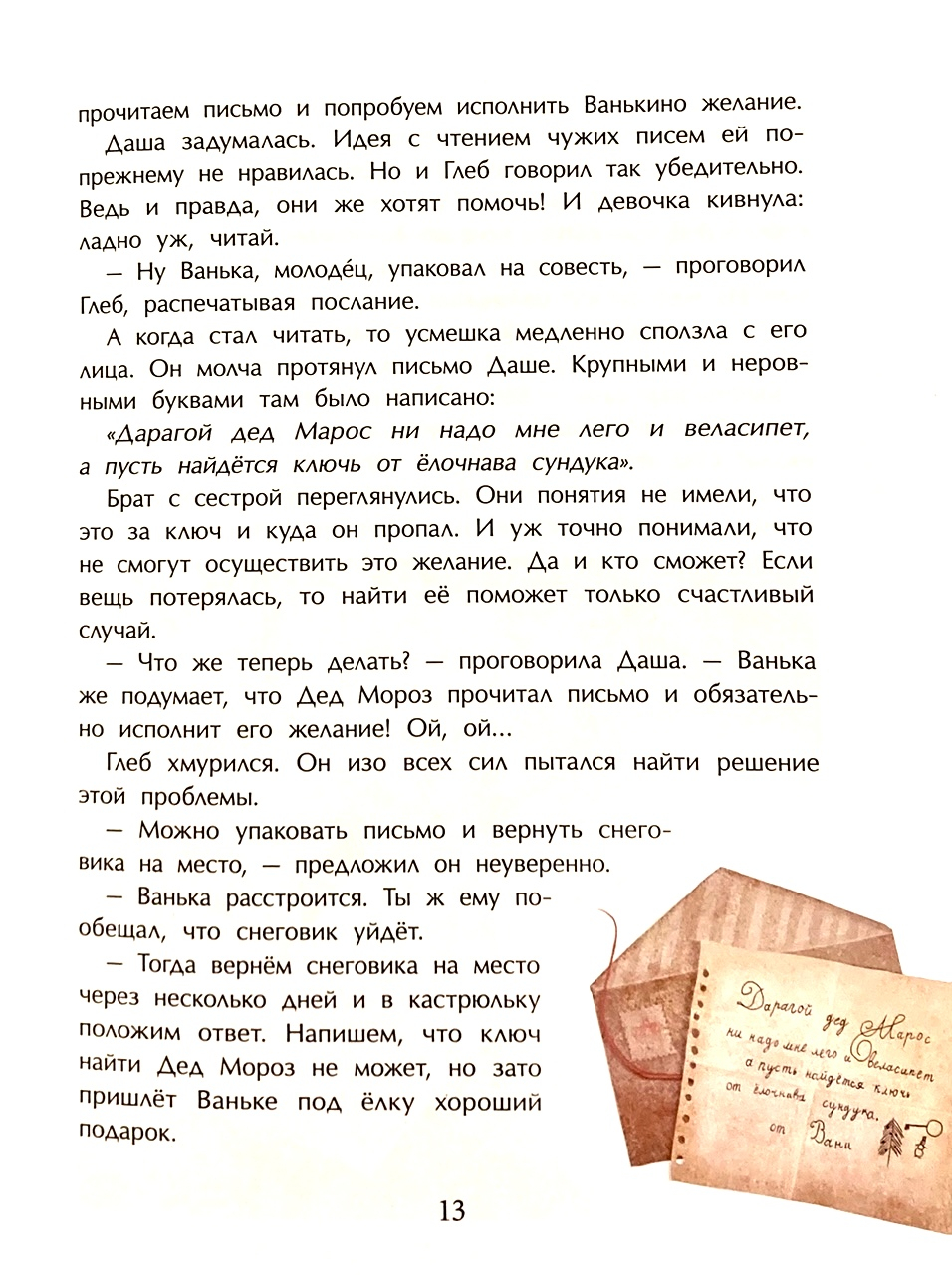 Чудесная новогодняя история — добрая, умная, трогательная, проникнутая запахами зимы, ожиданием приближающегося праздника, мечтой о нарядной ёлке. Но чтобы праздник состоялся, героям книги — шестилетнему Ване и его дедушке — надо открыть старинный сундук, в котором хранятся ёлочные игрушки, а ключ от сундука незадолго до Нового года бесследно исчез…