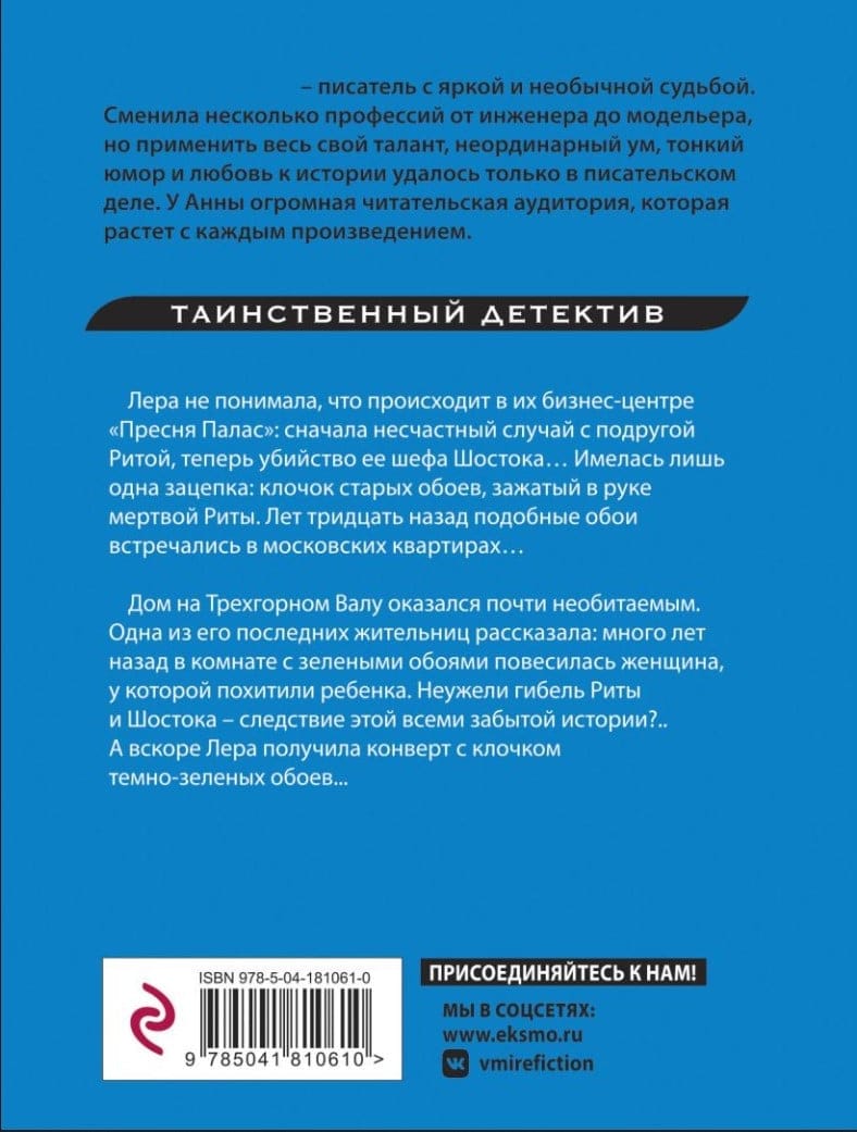 Участники новогоднего карнавала закружились в танце. И вдруг праздничный шум перекрыл женский крик. Танцующие расступились. В центре вестибюля лежал мужчина в костюме Дракулы. Из-под тела натекла лужа крови, рядом валялся брошенный пистолет… Лера не понимала, что происходит в их бизнес-центре «Пресня Палас»: сначала несчастный случай с подругой Ритой, теперь убийство ее шефа Шостока… Имелась лишь одна зацепка: клочок старых обоев, зажатых в руке мертвой Риты. Лет тридцать назад подобные обои встречались в московских квартирах… Дом на Трехгорном валу оказался почти необитаемым. Одна из его последних жительниц рассказала: много лет назад в комнате с зелеными обоями повесилась женщина, у которой похитили ребенка. Неужели гибель Риты и Шостока — следствие этой всеми забытой истории?.. А вскоре Лера получила конверт с клочком темно-зеленых обоев...