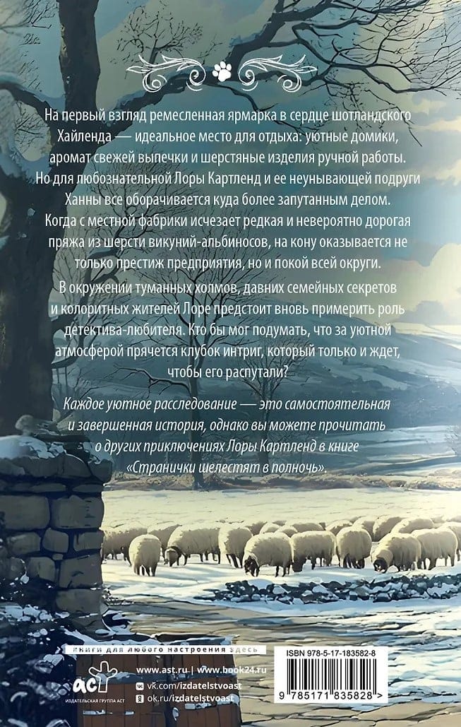 На первый взгляд ремесленная ярмарка в сердце шотландского Хайленда — идеальное место для отдыха: уютные домики, мирно пасущиеся стада овец, аромат свежей выпечки и шерстяные изделия ручной работы. Но для любознательной Лоры Картленд и ее неунывающей подруги Ханны все оборачивается куда более запутанным делом. Когда с местной фабрики исчезает редкая и невероятно дорогая пряжа из шерсти викуний-альбиносов, на кону оказывается не только престиж предприятия, но и покой всей округи.