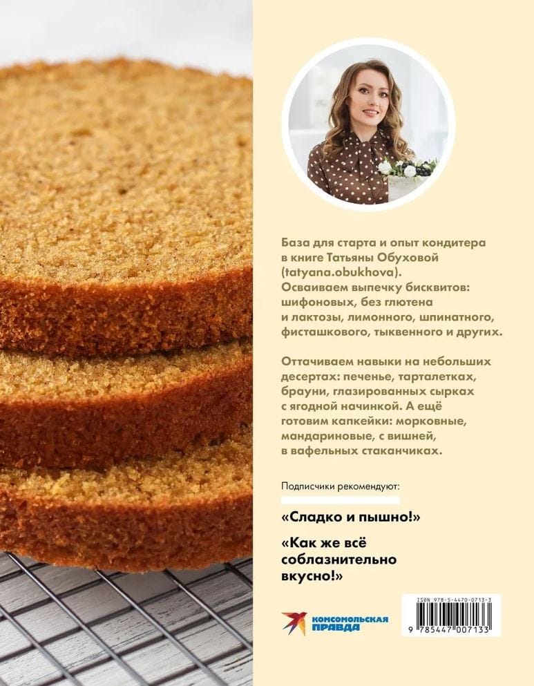 Всё начинается с идеального бисквита! Простые, но эффектные рецепты для начинающих кондитеров и кондитеров с амбициями. Базовые навыки и виртуозные советы для развития в книге мастера выпечки Татьяны Обуховой (tatyana.obukhova). Осваиваем выпечку бисквитов: шифоновых, без глютена и лактозы, лимонного, шпинатного, фисташкового, тыквенного и других. Оттачиваем навыки на небольших десертах: печенье, тарталетках, брауни, глазированных сырках с ягодной начинкой. А ещё готовим капкейки: морковные, мандариновые, с вишней, в вафельных стаканчиках. Подписчики Татьяны не устают благодарить автора за рецепты: «Сладко и пышно!», «Как же всё соблазнительно вкусно!», «Получается с первого раза!». Присоединяйтесь к компании мастеров безупречной выпечки.