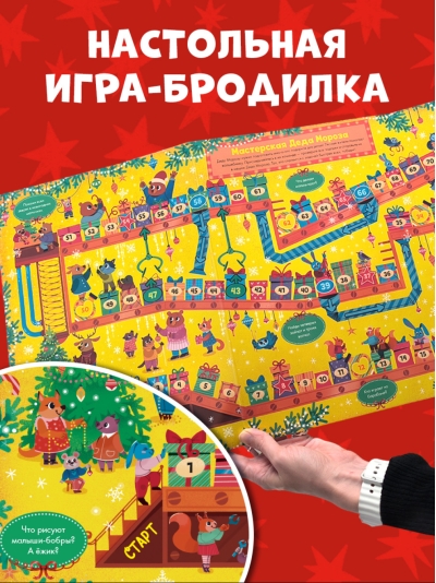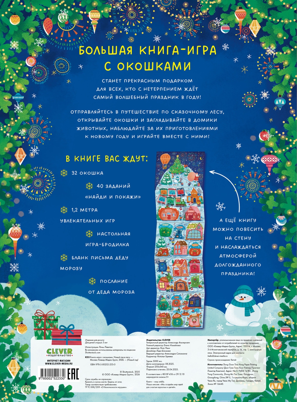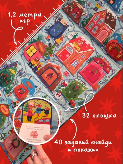 На разворотах Clever книги 1,2 метра игр, 32 окошка, 40 заданий «найди и покажи» и настольная игра-бродилка для уютного семейного досуга.