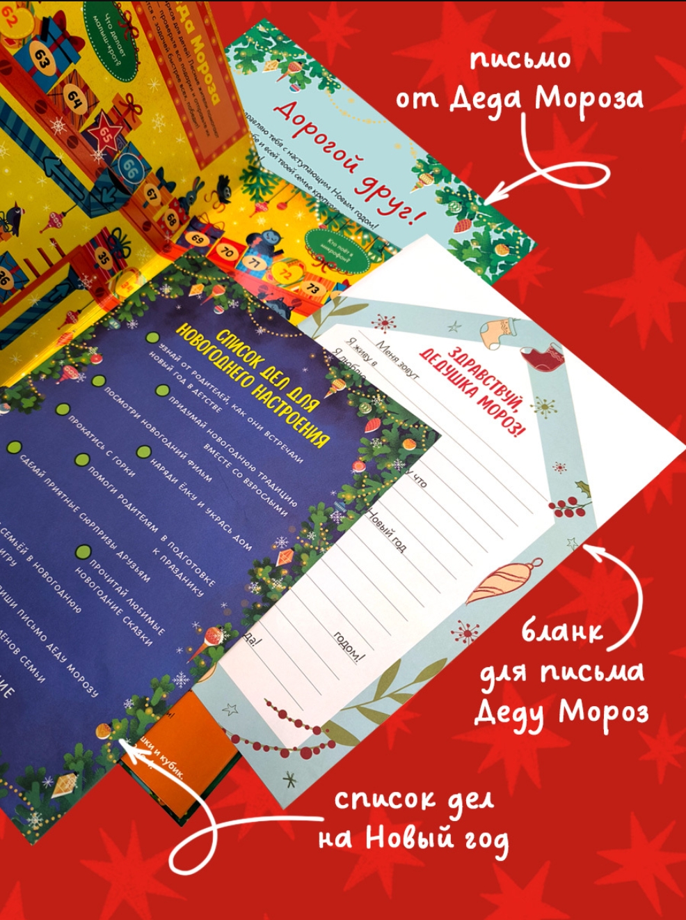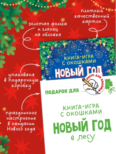 «Новый год в лесу» — это не просто книга. Это увлекательная игра с самыми разными заданиями. Книжка с окошками раскладывается и может превратиться в плакат, который вешается на стену (для этого есть отверстие). В ней есть задания, письмо от Деда Мороза и бланк для письма Деду Морозу, а еще игры: бродилки, «найди и покажи». Вас ждет путешествие по сказочному лесу — открывайте окошки и заглядывайте в домики животных, наблюдайте за их приготовлениями.