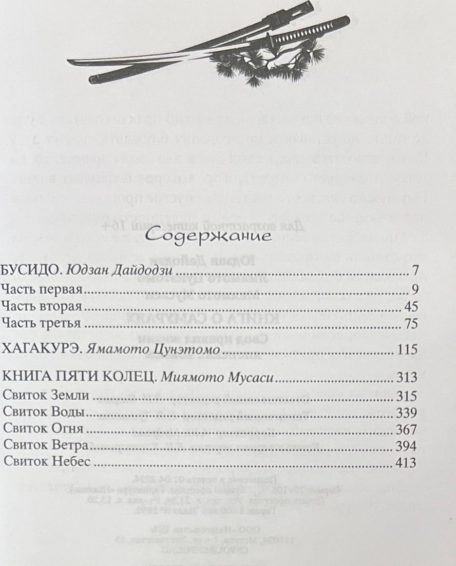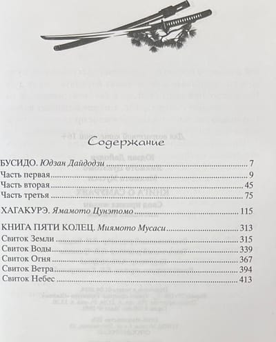 «Бусидо» Юдзана Дайдодзи — это кодекс чести, который определяет правила поведения самураев — профессиональных воинов, определявших историю своей страны на протяжении веков. Он наставлял самураев быть честными и мужественными, требовал от них быть готовыми к смерти в любой момент, если это было необходимо. «Хагакурэ» — авторитетный трактат Ямамото Цунэтомо — великого самурая, пытавшегося по-своему ответить на вопрос: «Как мы живем? Как мы умираем?» Миямото Мусаси — личность легендарная — воин, мастер меча, а кроме того, художник-каллиграф, оставивший письменный труд, занимающий важное место в истории японской культуры. На протяжении жизни он вышел победителем в огромном количестве поединков и участвовал в шести войнах. Его «Книга пяти колец» является неким компендиумом об искусстве меча и трактатом по стратегии.