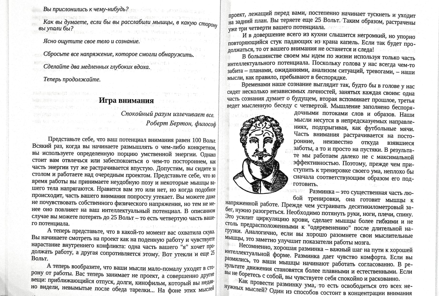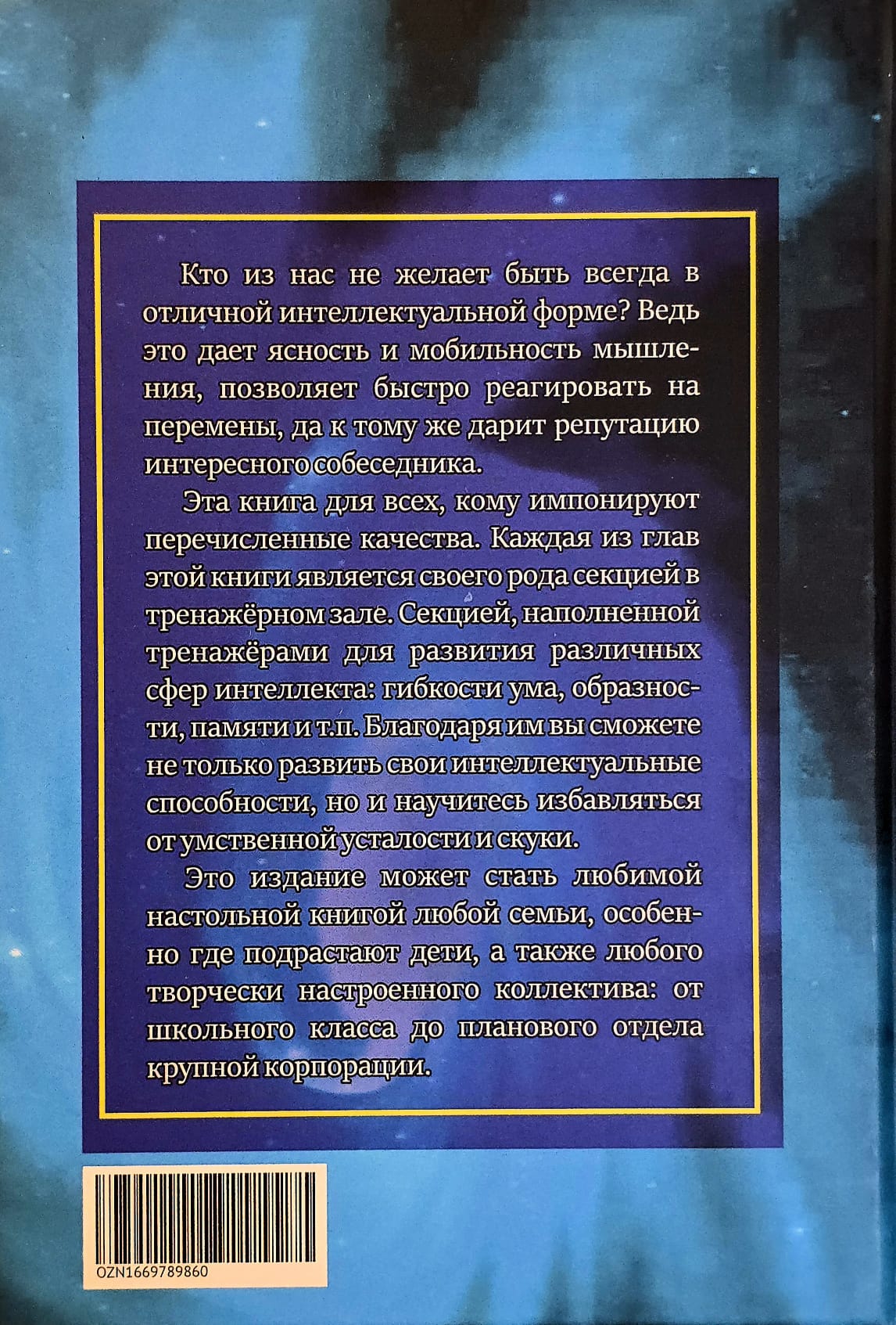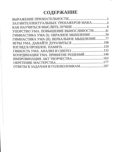 Эта книга для всех, кому импонируют перечисленные качества. Каждая из глав этой книги является своего рода секцией в тренажёрном зале. Секцией, наполненной тренажерами для развития различных сфер интеллекта: гибкости ума, образности, памяти и т.п, Благодаря им вы сможете не только развить свои интеллектуальные способности, но и научитесь избавляться от умственной усталости и скуки.