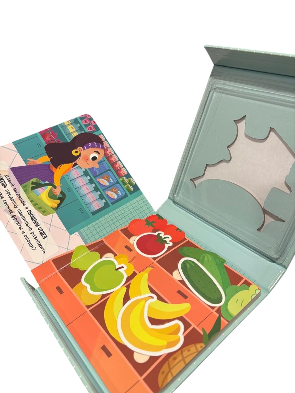 Погрузите вашего малыша в волшебный мир покупок с нашей развивающей книгой-сортер «Иду в магазин»! Это не просто книга, а интерактивное приключение, которое делает обучение веселым и увлекательным. Данная развивашка помогает маленьким исследователям познакомится с процессом посещения магазинов: освоить навыки складывать необходимые продукты в корзину, раскладывать товары на витрине и даже оплачивать их на кассе.