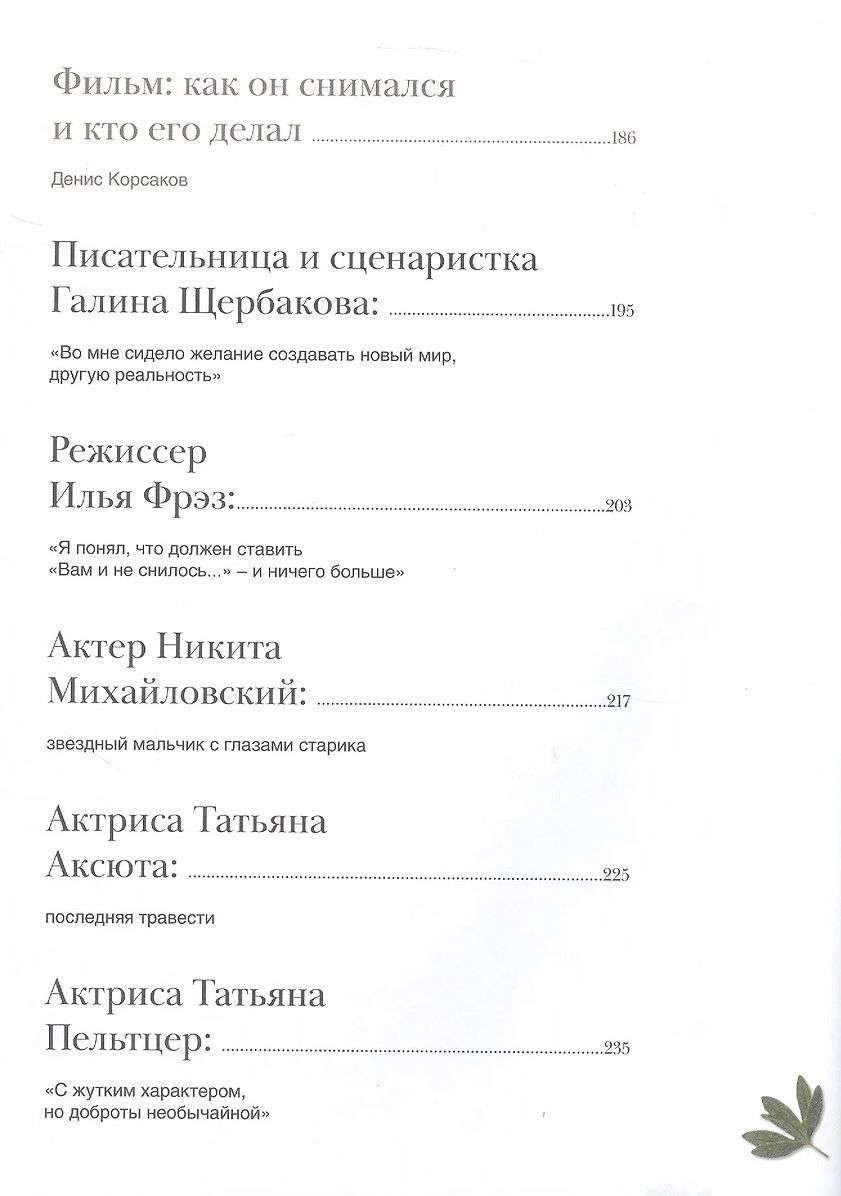 «Вам и не снилось...» Галины Щербаковой – пронзительная повесть о подростковой любви, обернувшаяся одной из самых волшебных мелодрам в истории советского и мирового кино. В этой книге – и сама повесть, и рассказ об эпохе, когда она была издана. Погружение в ранние 80-е, удивительные и незабываемые, сложные, переломные, прекрасные, когда билет в кино стоил 50 копеек, а за хорошими книгами выстраивались очереди. И, главное, о тех, кто участвовал в создании фильма: о сценаристке, режиссере и об актерах, от которых уже 45 лет невозможно отвести глаз, – откровенные истории, невероятные повороты личных сюжетов. Настоящая энциклопедия культовых повести и фильма. Книга о любви и юности – великолепный оригинальный подарок для всех, кто с нежностью вспоминает прошлое и ценит настоящее – время, качество, чувства.