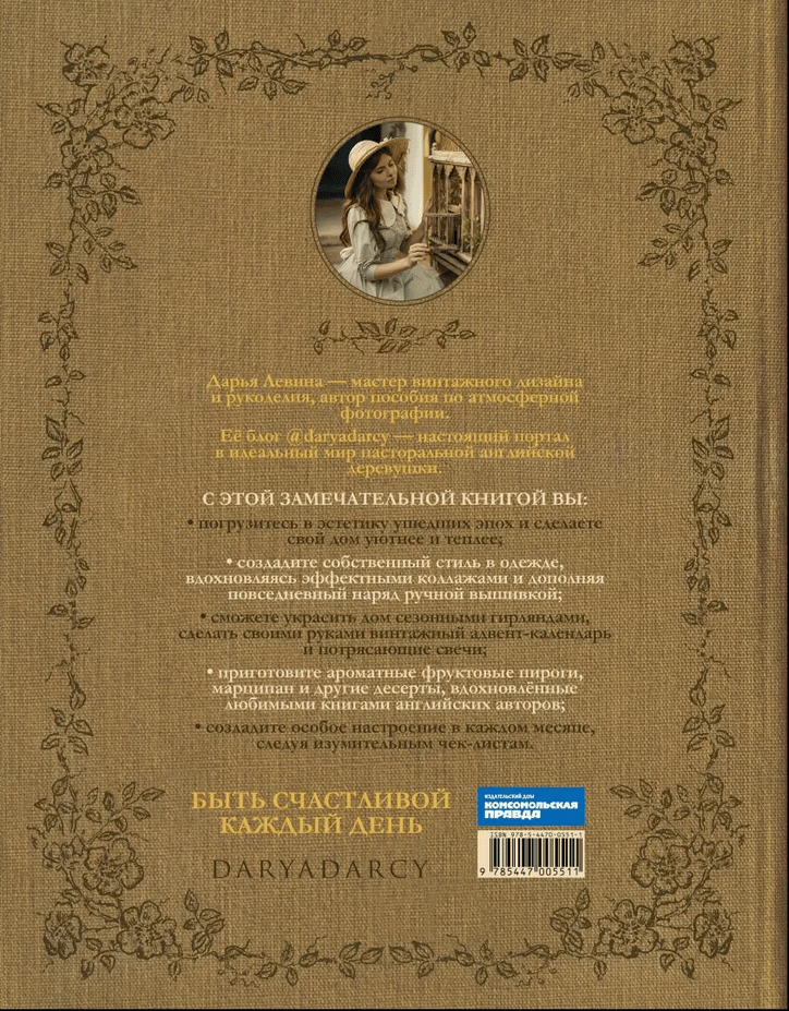 Путешествие в мир красоты! Дарья Левина – мастер винтажного дизайна и рукоделия, автор пособия по атмосферной фотографии. Ее блог @daryadarcy – настоящий портал в идеальный мир пасторальной английской деревушки. С этой замечательной книгой вы: погрузитесь в эстетику ушедших эпох и сделаете свой дом уютнее и теплее; создадите собственный стиль в одежде, вдохновляясь эффектными коллажами и дополняя повседневный наряд ручной вышивкой; сможете украсить дом сезонными гирляндами, сделать своими руками винтажный адвент-календарь и потрясающие свечи; приготовите ароматные фруктовые пироги, марципан и другие десерты, вдохновлённые любимыми книгами английских авторов; создадите особое настроение в каждом месяце, следуя изумительным чек-листам.