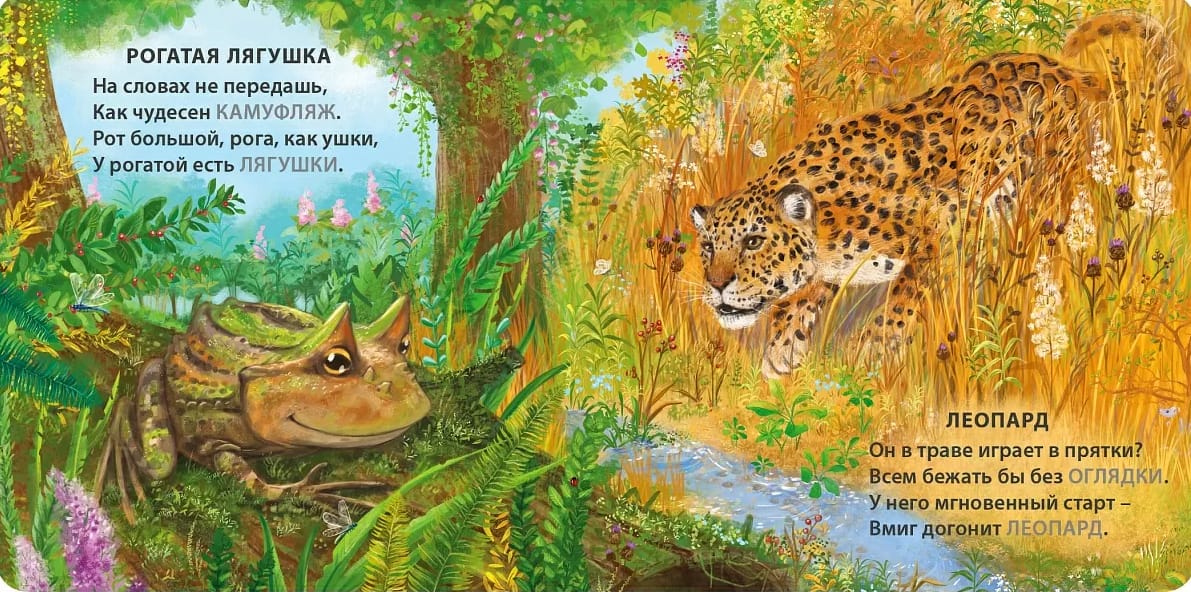 Книжка-картонка «Животные-невидимки. Загадки-рифмы» в стихах Евгения Сосновского познакомит малыша с разными животными и тем, как они маскируются в природе. Стихи написаны так, чтобы ребёнок смог сам срифмовать название животного или другие слова.