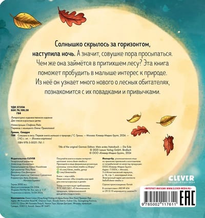 Солнышко скрылось за горизонтом, наступила ночь. А значит, совушке пора просыпаться. Чем же она займется в притихшем лесу? Из этой яркой книжки малыш узнает много нового о лесных обитателях, познакомится с их повадками и привычками.