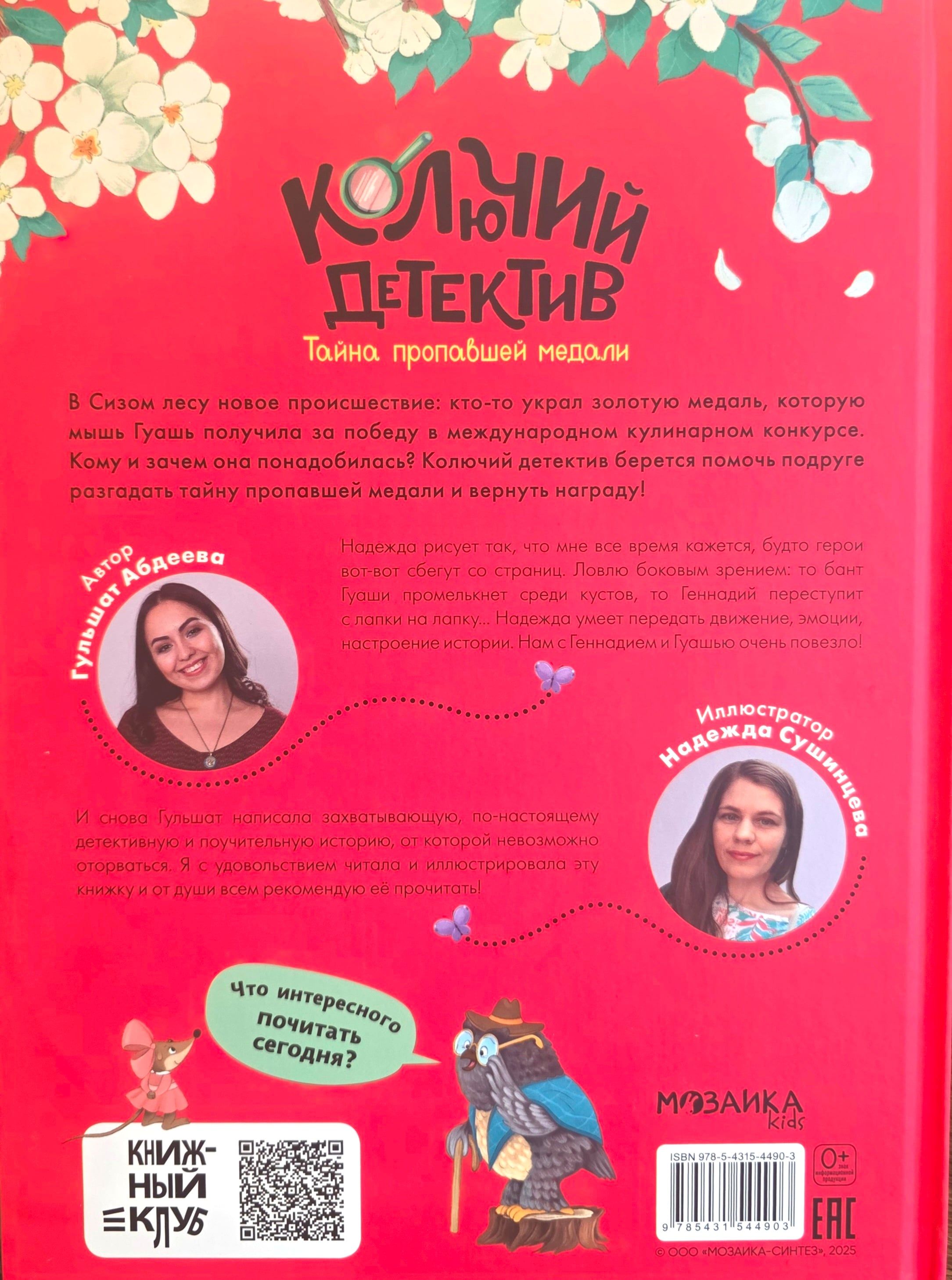 Книга «Колючий детектив. Тайна пропавшей медали» из серии «Книжный клуб. Почитаем вместе?» — это новая история о приключениях ежа Геннадия и его друзей. В Сизом лесу снова происшествие: кто-то украл золотую медаль, которую мышь Гуашь получила за победу в международном кулинарном конкурсе. Кому и зачем она понадобилась? Колючий детектив берется помочь подруге разгадать тайну пропавшей медали и вернуть награду.