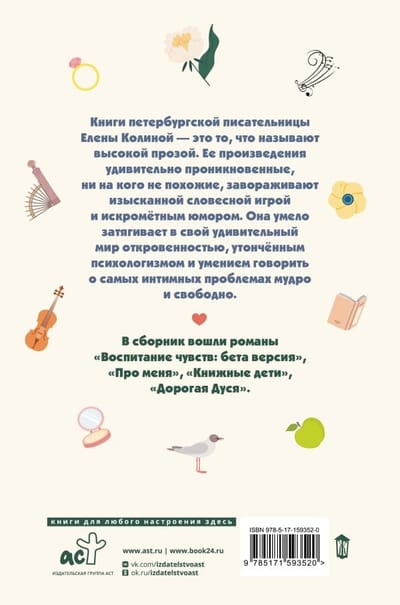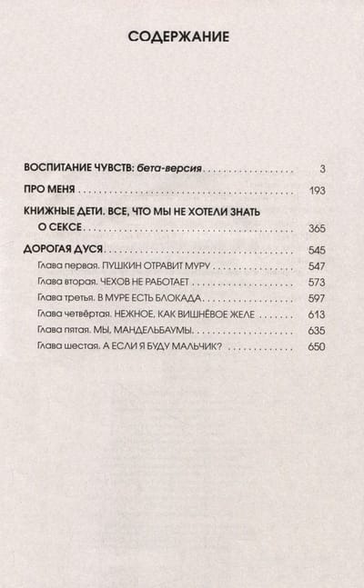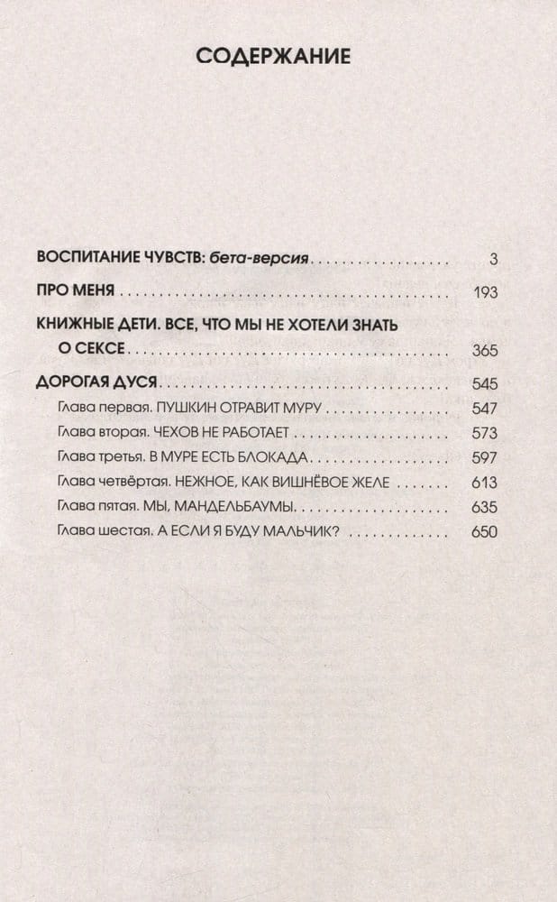 В сборник вошли романы «Воспитание чувств: бета версия», «Про меня», «Книжные дети», «Дорогая Дуся».