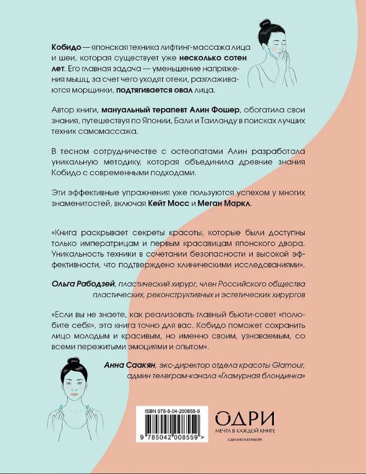 Автор книги, француженка Алин Фошер, является дипломированным мануальным терапевтом. Она обогатила свои знания, путешествуя по Японии, Бали и Таиланду в поисках лучших техник самомассажа. В тесном сотрудничестве с остеопатами и психотерапевтами Алин разработала уникальную методику лифтинг-массажа, которая объединила древние знания Кобидо с современными подходами. Эти эффективные упражнения уже пользуются успехом у многих знаменитостей, включая Кейт Мосс и Меган Маркл.