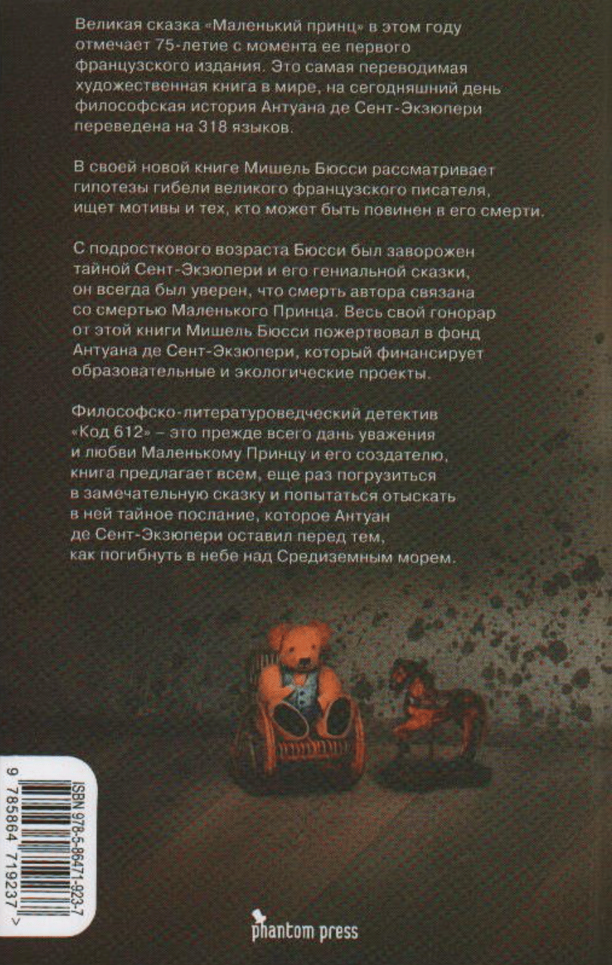 Великая сказка «Маленький принц» в этому году отмечает 80-летие с момента ее первого французского издания. Это самое переводимое художественное произведение в мире, на сегодняшний день философская история Антуана де Сент-Экзюпери переведена на 318 языков. В своей новой книге Мишель Бюсси рассматривает гипотезы гибели великого французского писателя, ищет мотивы и тех, кто может быть повинен в его смерти. С подросткового возраста Бюсси был заворожен тайной Сент-Экзюпери и его гениальной сказки, он всегда был уверен, что смерть автора связана со смертью Маленького принца. Весь свой гонорар от этой книги Мишель Бюсси пожертвовал в фонд Антуана де Сент-Экзюпери, который финансирует образовательные и экологические проекты. Философско-литературоведческий детектив «Код 612» – это прежде всего дань уважения и любви «Маленькому принцу» и его создателю, книга предлагает всем еще раз погрузиться в замечательную сказку и попытаться отыскать в ней тайное послание, которое Антуан де Сент-Экзюпери оставил перед тем, как погибнуть в небе над Средиземным морем.