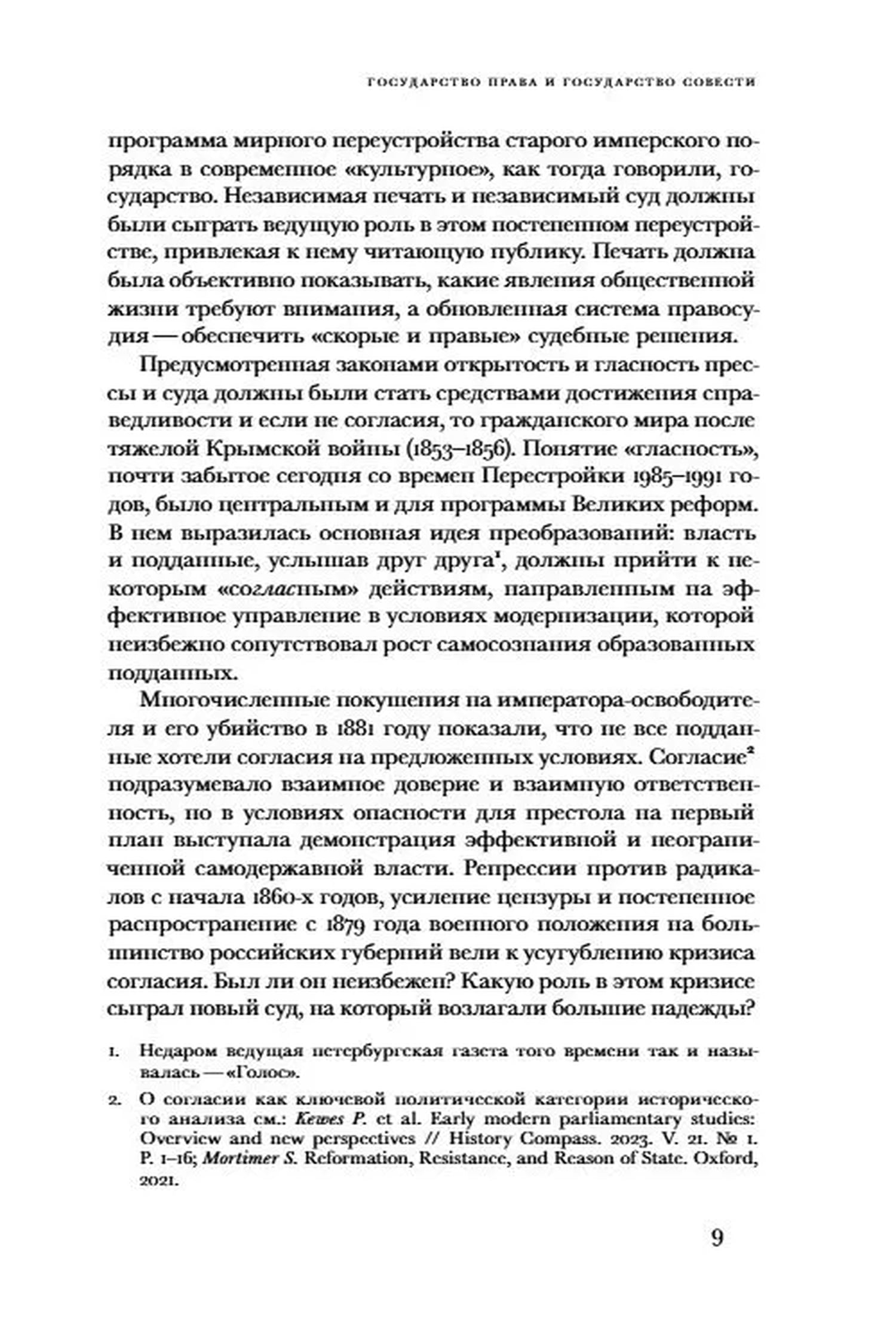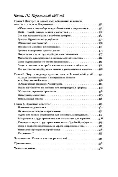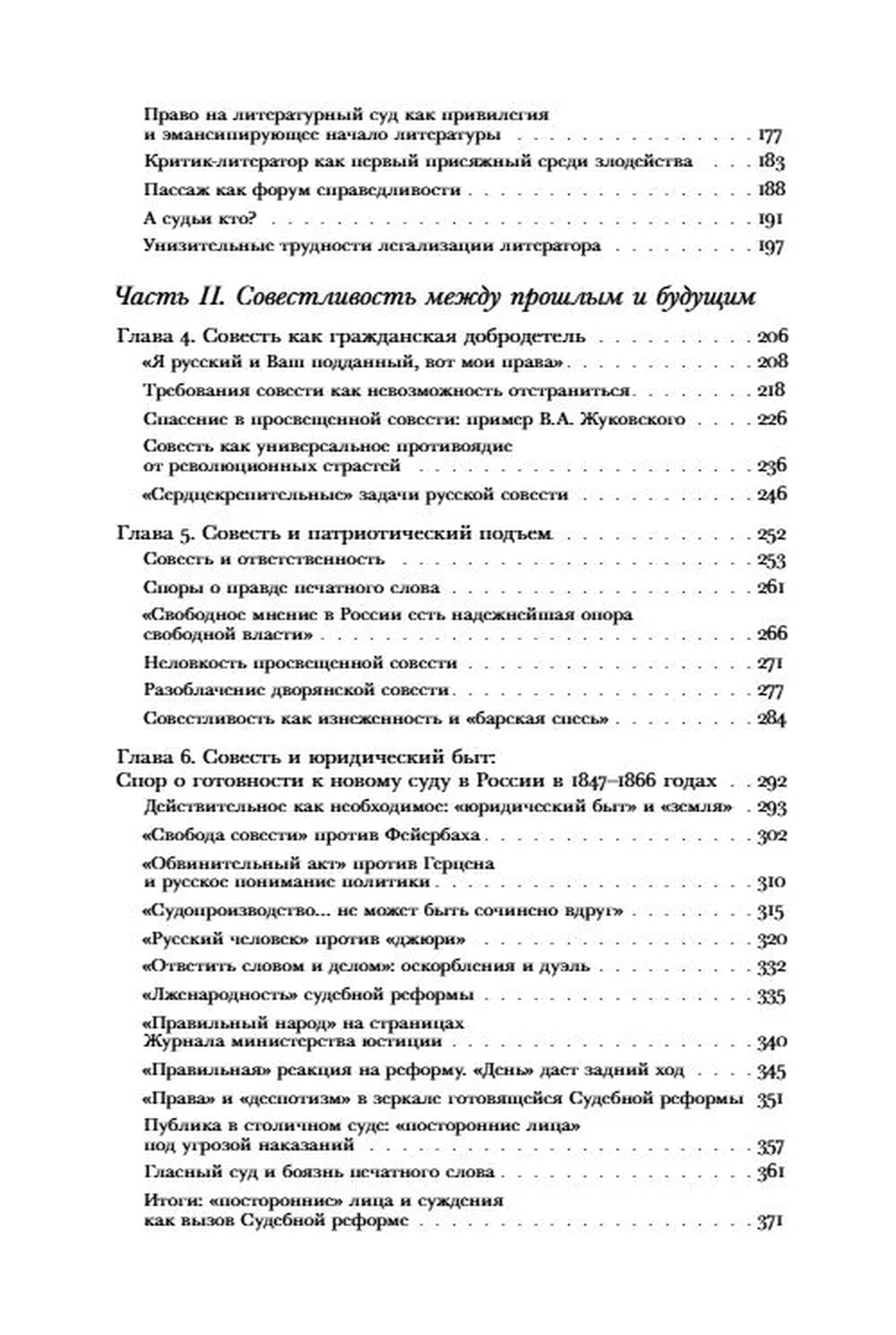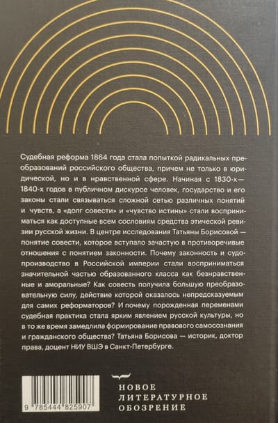 В центре исследования Татьяны Борисовой — понятие совести, которое вступало зачастую в противоречивые отношения с понятием законности. Почему законность и судопроизводство в Российской империи стали восприниматься значительной частью образованного класса как безнравственные и аморальные? Как совесть получила большую преобразовательную силу, действие которой оказалось непредсказуемым для самих реформаторов? И почему порожденная переменами судебная практика стала ярким явлением русской культуры, но в то же время замедлила формирование правового самосознания и гражданского общества?