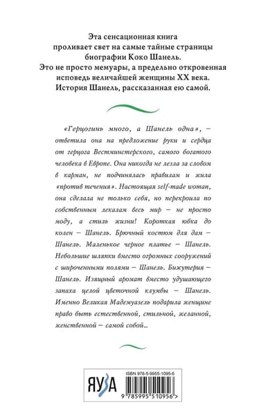 Эта сенсационная книга впервые проливает свет на самые тайные страницы биографии Коко Шанель. Это не просто мемуары, а предельно откровенная исповедь величайшей женщины XX века. История Шанель, рассказанная ею самой.