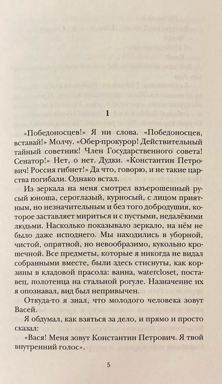 Представьте, что однажды утром вы проснулись и вдруг поняли: в своей голове вы не один. Там неведомым образом появился сосед – человек, умерший сто с лишним лет назад и ничего не знающий о современной действительности. При этом всё абсолютно реально и не имеет ничего общего с психическим расстройством. Такая история случилась с мелким муниципальным чиновником Васей Васнецовым, в голове которого нежданно появился член Государственного совета и обер-прокурор Святейшего синода Константин Петрович Победоносцев.