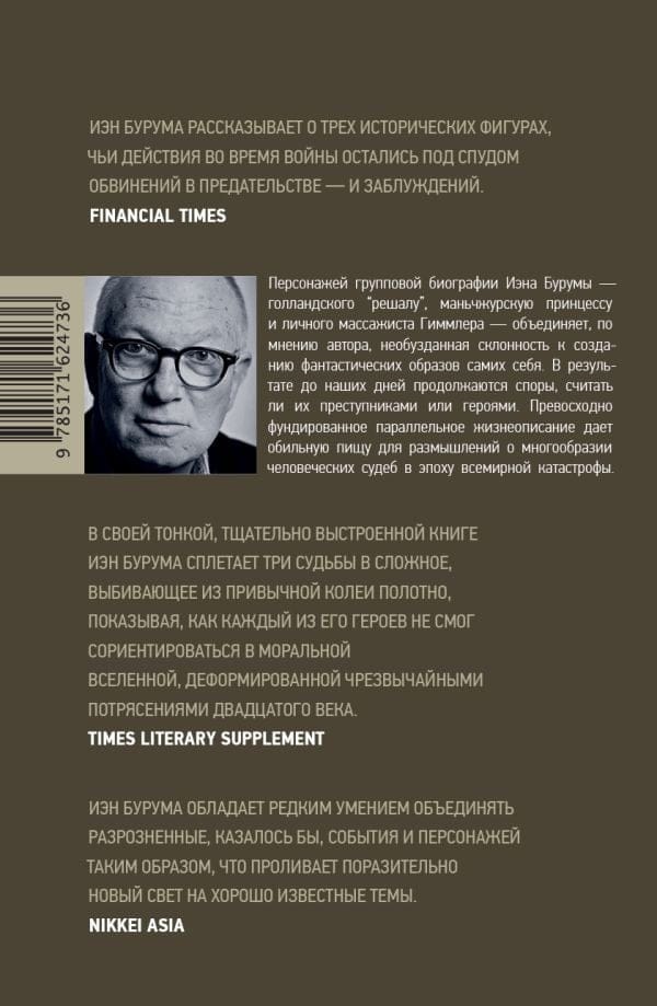 Казалось бы, что общего между голландским евреем-«решалой», маньчжурской принцессой и личным массажистом Гиммлера? Однако именно они стали центральными персонажами групповой биографии Иэна Бурумы. По мнению автора, их объединяет необузданная склонность к созданию фантастических образов самих себя. В результате до сих пор продолжаются споры, считать ли их преступниками или героями. Превосходно фундированное параллельное жизнеописание дает обильную пищу для размышлений о многообразии человеческих судеб в эпоху всемирной катастрофы.