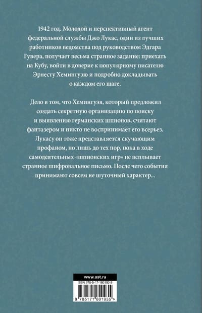 Дело в том, что Хемингуэя, который предложил создать секретную организацию по поиску и выявлению германских шпионов, считают фантазером и никто не воспринимает его всерьез. Лукасу он тоже представляется скучающим профаном, но лишь до тех пор, пока в ходе самодеятельных «шпионских игр» не всплывает странное шифровальное письмо. После чего события принимают совсем не шуточный характер...