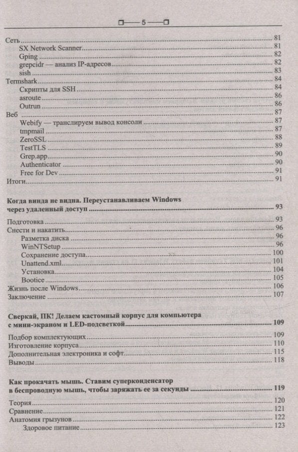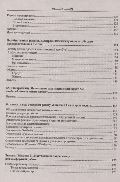 Эта книга — сборник лучших, тщательно отобранных статей из легендарного журнала «Хакер». Рассмотрены операционные системы Windows 11 и Linux с точки зрения организации эффективной работы на ПК. Описаны полезные приложения для этих ОС, утилиты для работы в терминале. Рассказано о программах для стеганографии — скрытия полезных данных в графических изображениях. Даны практические советы для пользователей Windows 11 по удаленной установке ОС, отключению телеметрии, удалению программ и компонент, тонкой настройке системы, ее оптимизации для работы на несовместимом и устаревшем оборудовании. Подробно описаны различные настройки Linux для безопасной работы. Представлены примеры постройки самодельного корпуса для ПК, установки суперконденсатора в беспроводную мышь, сборки самодельного ноутбука. Приведен обзор возможностей устройств Apple на базе процессоров Ml и даны советы по их эффективному использованию.