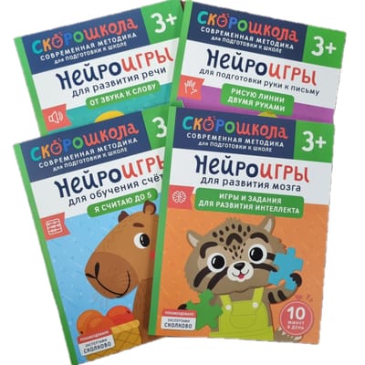 Это система развивающих пособий для подготовки к школе на основе современного нейропдхода. 4 книги помогут ребенку развить необходимые навыки по четырем основным напралениям: речь, счет, письмо, интелект.