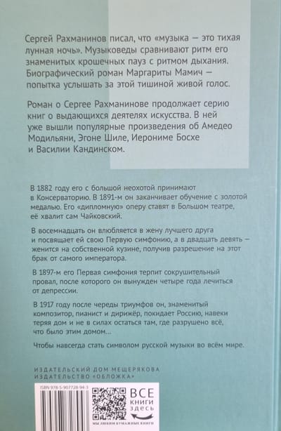 Сергей Рахманинов писал, что «музыка — это тихая лунная ночь». Музыковеды сравнивают ритм его знаменитых крошечных пауз с ритмом дыхания. Биографический роман Маргариты Мамич — попытка услышать за этой тишиной живой голос.