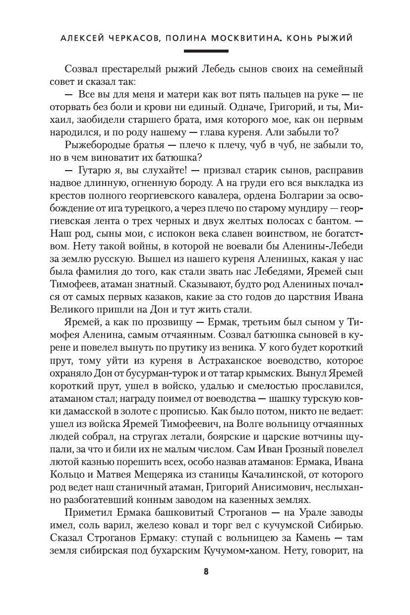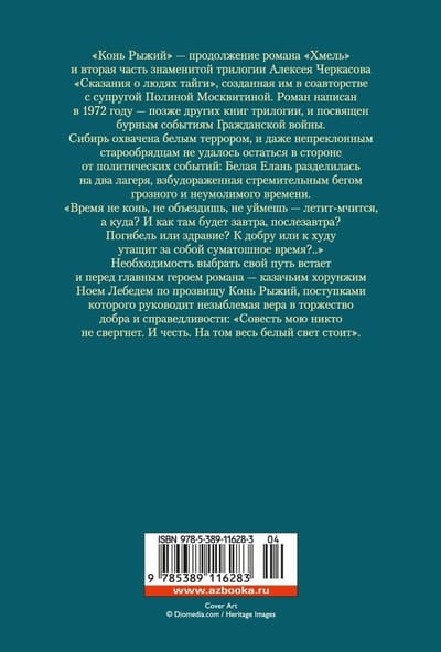 «Конь Рыжий» – продолжение романа «Хмель» и вторая часть знаменитой трилогии Алексея Черкасова «Сказания о людях тайги», созданная им в соавторстве с супругой Полиной Москвитиной. Роман написан в 1972 году – позже других книг трилогии, и посвящен бурным событиям Гражданской войны. Сибирь охвачена белым террором, и даже непреклонным старообрядцам не удалось остаться в стороне от политических событий: Белая Елань разделилась на два лагеря, взбудораженная стремительным бегом грозного и неумолимого времени. «Время не конь, не объездишь, не уймешь – летит-мчится, а куда? И как там будет завтра, послезавтра? Погибель или здравие? К добру или к худу утащит за собой суматошное время?..» Необходимость выбрать свой путь встает и перед главным героем романа – казачьим хорунжим Ноем Лебедем по прозвищу Конь Рыжий, поступками которого руководит незыблемая вера в торжество добра и справедливости: «Совесть мою никто не свергнет. И честь. На том весь белый свет стоит».