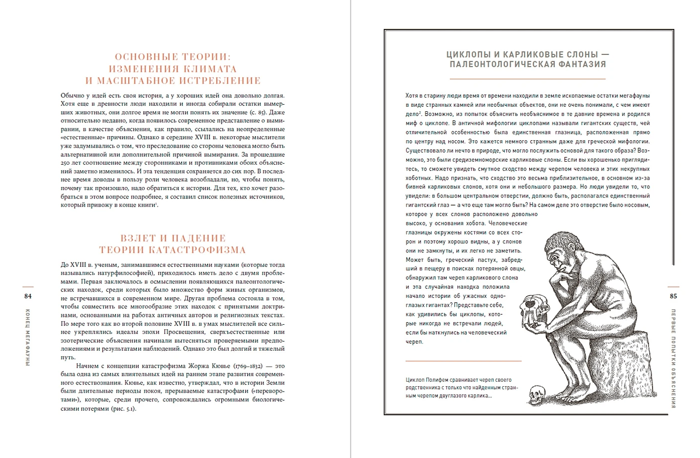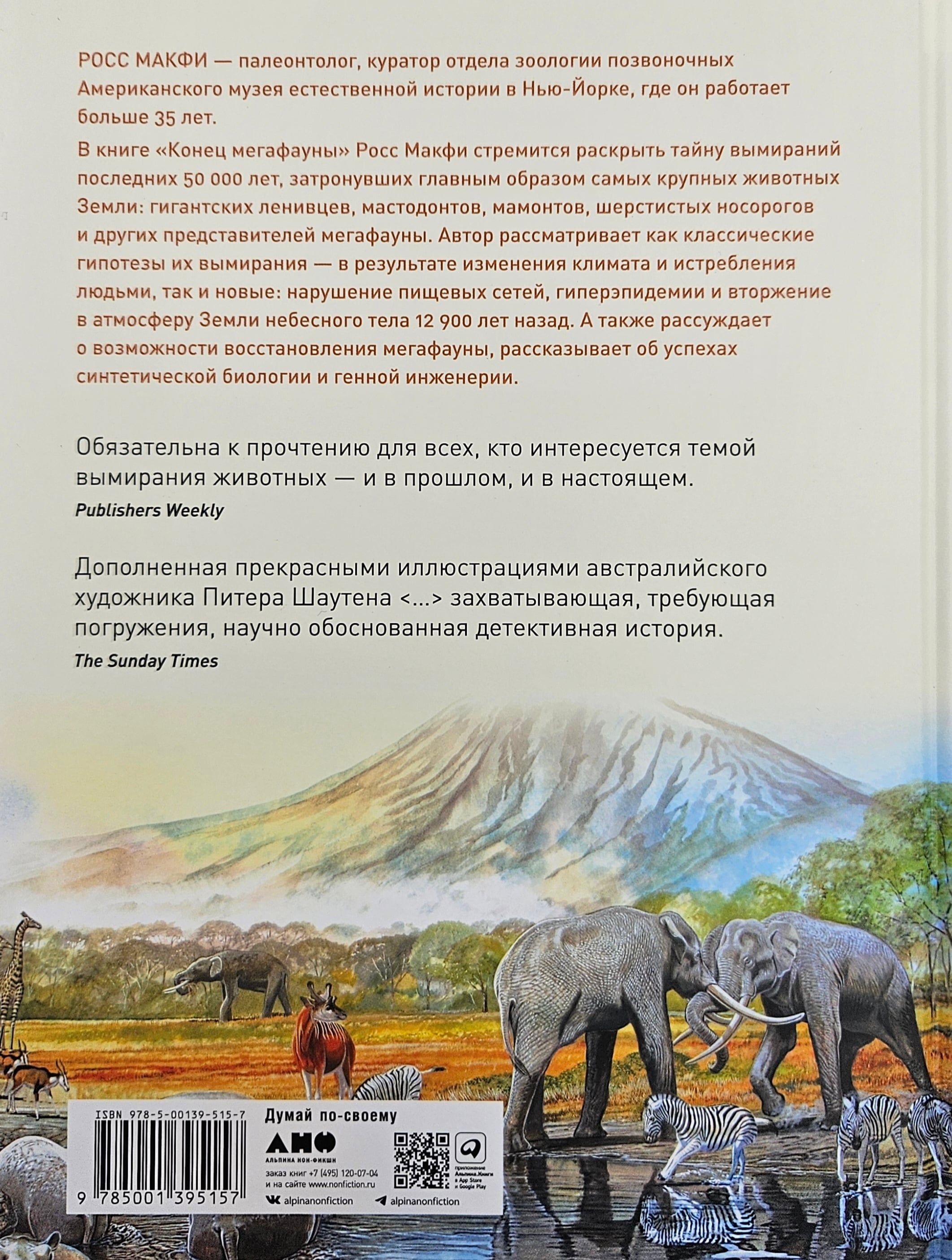 Палеонтолог Росс Макфи стремится раскрыть тайну вымираний последних 50 000 лет, затронувших главным образом самых крупных животных Земли. Среди них — гигантские ленивцы, мастодонты, мамонты, шерстистые носороги и другие представители мегафауны. Автор рассматривает как классические гипотезы их вымирания — в результате изменения климата и истребления людьми, так и новые: нарушение пищевых сетей, гиперэпидемии и вторжение в атмосферу Земли небесного тела 12 900 лет назад. Это позволяет связать воедино множество палеонтологических и археологических данных, в том числе полученных в результате новейших исследований. В завершение Макфи рассуждает о возможности восстановления мегафауны, рассказывает об успехах синтетической биологии и генной инженерии — в частности о попытках возродить шерстистого мамонта.
