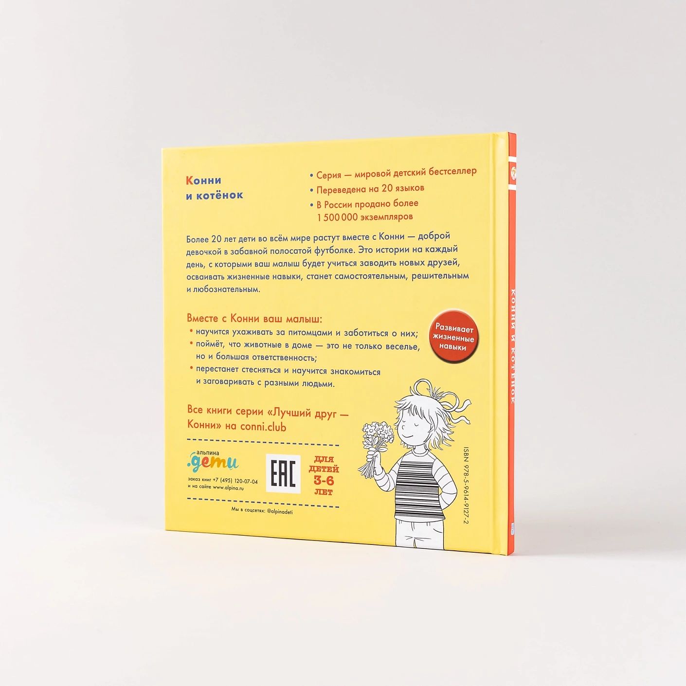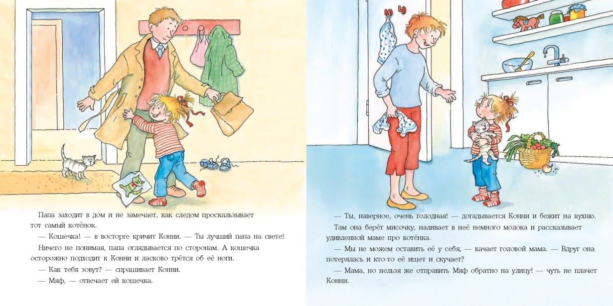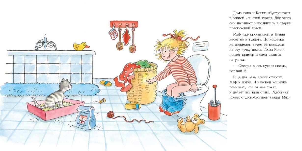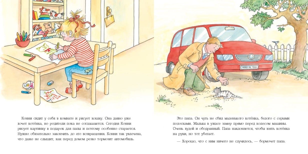 Серия охватывают все жизненные навыки, с которыми ребенок встречается во время взросления от 3 до 14 лет. Ассоциируя себя с главной героиней, малыш проживает ее историю, учится и познает мир. О чем книга В этой истории малыш на примере Конни поймет, что у всех поступков есть последствия. Однажды в дом маленькой героини попадает маленький котенок, и Конни просит его оставить. Кроме радостных игр в ее жизни появились еще и заботы. Ведь за питомцем нужно ухаживать, водить к ветеринару, убирать разбросанные вещи, приучать к туалету и когтеточке. Гид для родителей, или Что вы можете сделать с этой книгой Развивайте жизненные навыки Книга учит брать на себя ответственность и договариваться со взрослыми. Малыш точно запомнит, что: домашнее животное — это не только игра и развлечение, но еще и большая ответственность; ваши питомцы требуют ежедневного ухода и заботы; у каждого поступка есть последствия; важно всегда сдерживать обещание, которое дал.