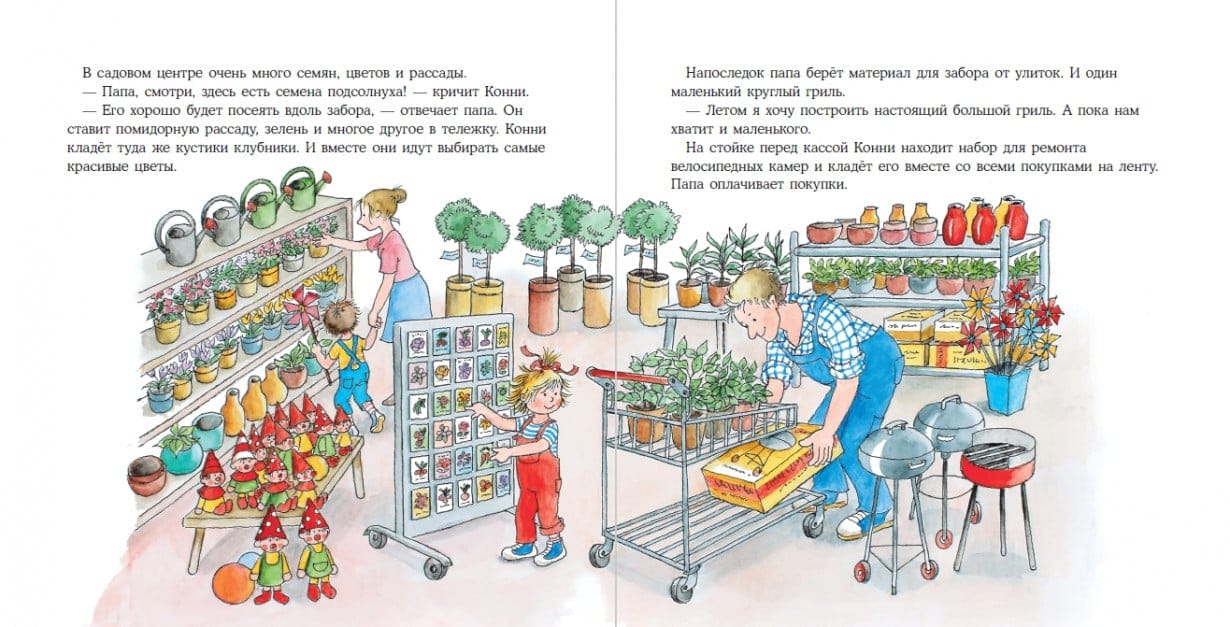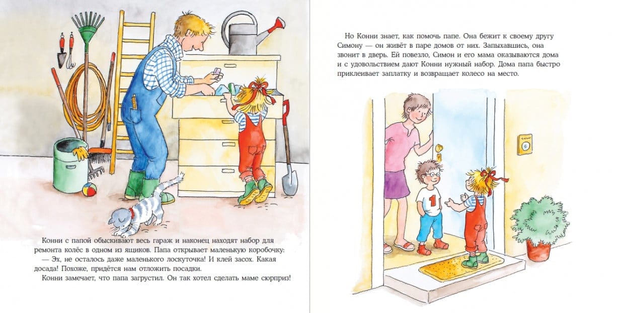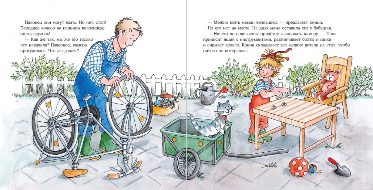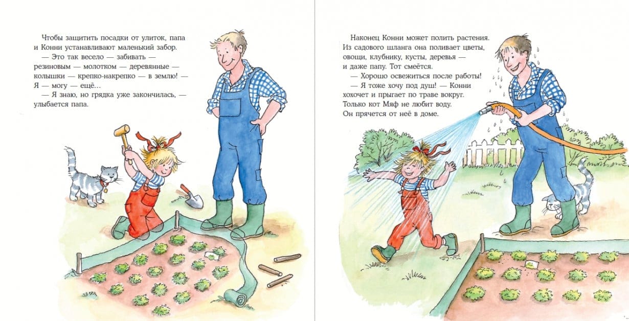С определенного возраста детям важно проводить время не только с мамой, но и с папой. Ведь папы совсем по-другому мыслят, чаще учат практичным хозяйственным вещам и, конечно, разрешают больше шалостей. Мама и младший брат Конни уезжают к маминой подруге, а Конни радуется, что папа на целых два дня только её! Вместе они спланируют красивый садик на заднем дворе, починят велосипед и устроят настоящий праздник к приезду мамы. Эту книгу стоит захватить с собой на дачу!