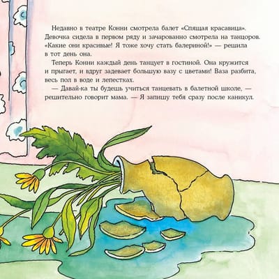 Гибкость, музыкальность, координация, артистичность — именно за это родители ценят танцы. А ребятам нравятся красивые костюмы, музыка и движения. Пример Конни поможет маленьким фантазёрам понять, хочется ли им заниматься танцами, а родителям — убедиться, что это отличный способ организации досуга малыша. Теперь Конни каждый день танцует в гостиной. Она кружится и прыгает, и вдруг задевает большую вазу с цветами! Ваза разбита, весь пол в воде и лепестках.