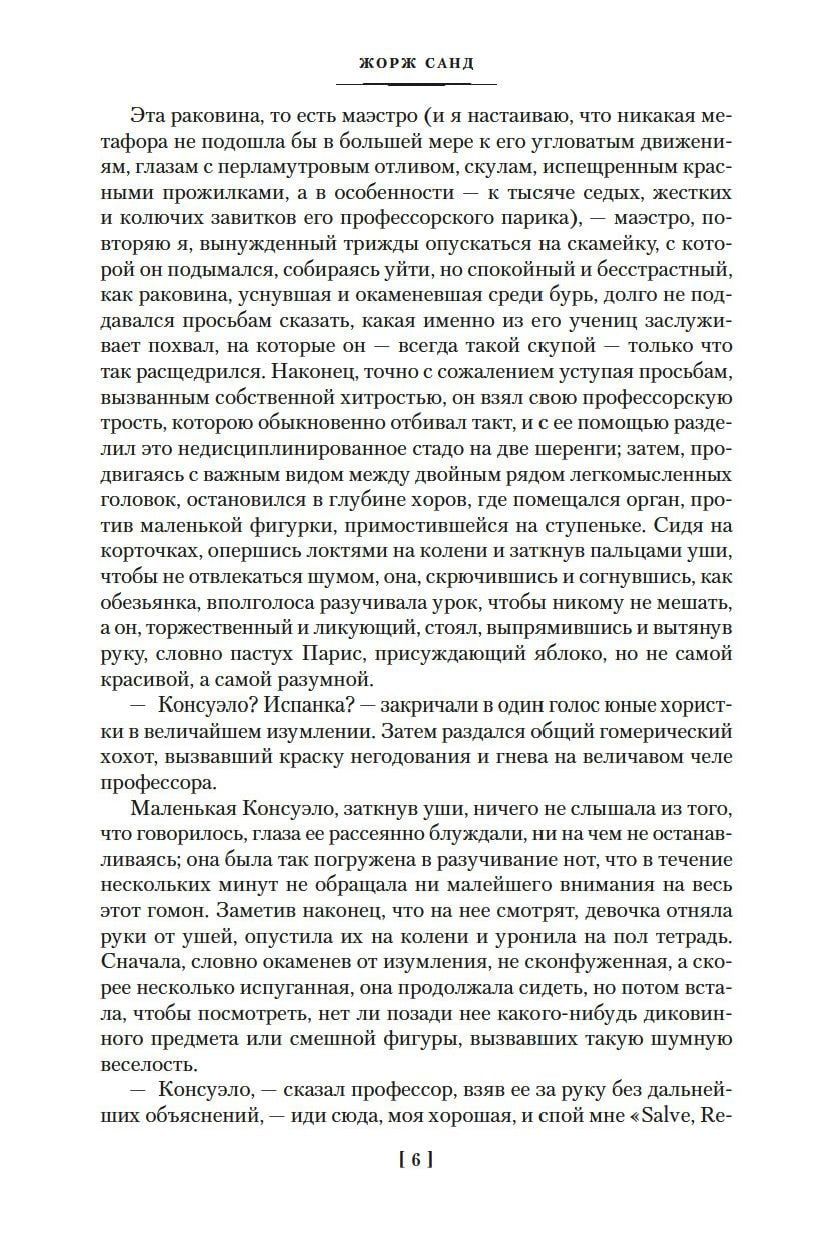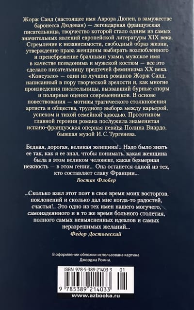 Жорж Санд (настоящее имя Аврора Дюпен, в замужестве баронесса Дюдеван) — легендарная французская писательница, творчество которой стало одним из самых значительных явлений европейской литературы XIX века. Стремление к независимости, свободный образ жизни, утверждение права женщины выбирать возлюбленного и пренебрежение брачными узами, мужское имя в качестве псевдонима и мужской костюм — все это сделало писательницу предтечей феминизма XX века.