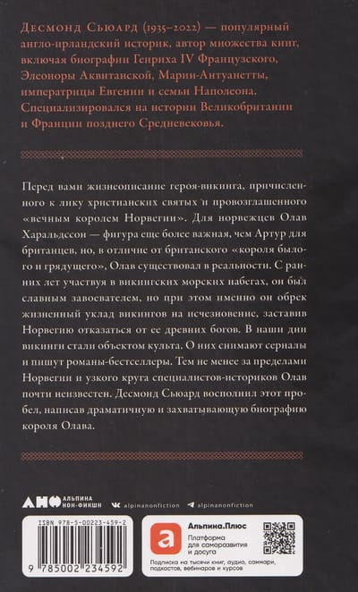 Перед вами жизнеописание героя-викинга, причисленного к лику христианских святых и провозглашенного «вечным королем Норвегии». Для норвежцев Олав Харальдссон — фигура еще более важная, чем Артур для британцев, но, в отличие от британского «короля былого и грядущего», Олав существовал в реальности. С ранних лет участвуя в викингских морских набегах, он был славным завоевателем, но при этом именно он обрек жизненный уклад викингов на исчезновение, заставив Норвегию отказаться от ее древних богов. В наши дни викинги стали объектом культа. О них снимают сериалы и пишут романы-бестселлеры. Тем не менее, за пределами Норвегии и узкого круга специалистов-историков Олав почти неизвестен. Десмонд Сьюард восполнил этот пробел, написав драматичную и захватывающую биографию короля Олава.