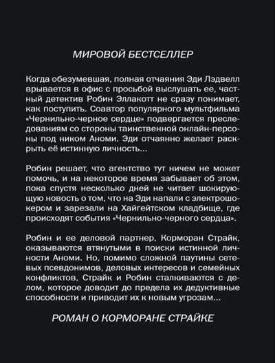 В агенство Страйка и Робин обращается девушка Эди Ледвелл, создательница популярного мультфильма «Чернильно-черное сердце». Она рассказывает про травлю в интернете и просит Робин помочь ей найти человека с ником Anomie, который своими преследованиями в Сети довел её до попытки самоубийства. Он пишет про нее грязные сплетни, обвиняет во всех смертных грехах и предлагает продолжить попытки расстаться с жизнью. Робин, ссылаясь на полную занятость агентства, предлагает ей обратиться к тем, кто специализируется на кибер-преступлениях. Девушка уходит, но через некоторое время СМИ сообщают о её смерти - Эди была жестоко убита на кладбище, а её партнёр по созданию мультфильма, Джош Блэй, в критическом состоянии доставлен в больницу.