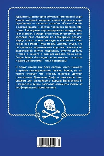 Тайна исчезновения Генри Эвери оставалась нераскрытой больше трех веков. И вдруг авторы книги нашли в архиве зашифрованное письмо. На основе этого документа они выдвинули свою версию дальнейшей жизни «короля пиратов», связав его с другими знаковыми личностями начала XVIII века — писателем и тайным агентом Даниелем Дефо, королем Вильгельмом III и королевой Анной, архиепископом кентерберийским Томасом Тенисоном — злейшим врагом католической Франции.