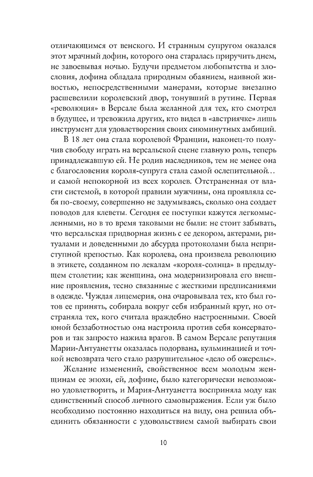 Фэшн-журналистка Сильви Ле Бра-Шово во всех подробностях воссоздала характер, эмоции, быт, и, конечно же, гардероб Марии-Антуанетты, ведь именно одежда определила ее образ, оставшийся в истории. Маленькая эрцгерцогиня, юная своенравная дофина, новоявленная королева Франции, еще не привыкшая к своему титулу, любящая мать — со сменой амплуа менялся и ее облик.