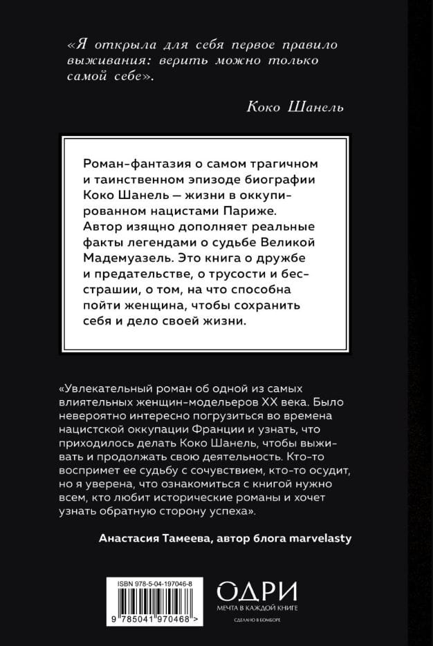 Роман-фантазия о самом трагичном и таинственном эпизоде в биографии Коко Шанель — жизни в оккупированном нацистами Париже. Автор изящно дополняет реальные факты легендами о судьбе Великой Мадемуазель. Это книга о дружбе и предательстве, о трусости и бесстрашии, о том, на что способна пойти женщина, чтобы сохранить себя и дело своей жизни.